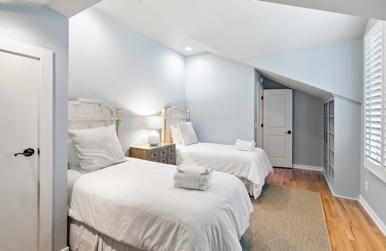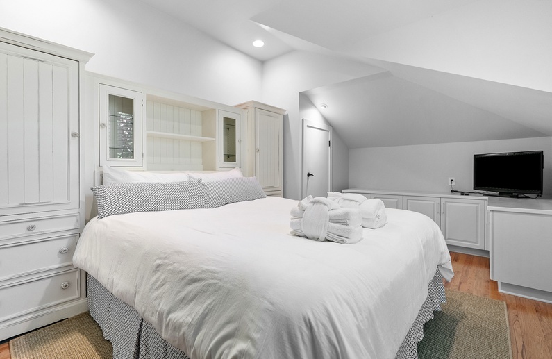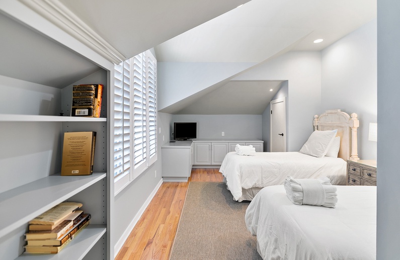 The fourth bedroom is a finished room over the garage offering 2 twin-sized beds and a TV. The fifth bedroom also offers a finished room over the garage with a king-sized bed and a TV. Both bedrooms have access to a full bathroom just across the hall with a shower-tub combination.