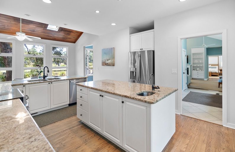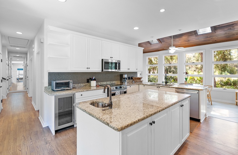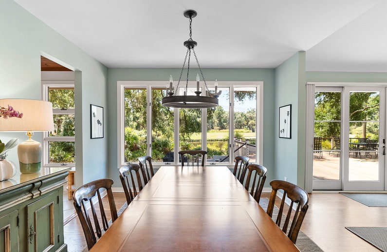 Upon entering the property, you’ll find exquisite finishes, ample living and entertainment spaces, high ceilings, and an abundance of natural light. Each area of the first floor fully captures the unparalleled views that Kiawah Island has to offer. In the main living area, you will find upscale and comfortable seating, a large flat-screen TV, additional seating for dining, and double sliding glass doors that provide access to the deck, pool, and spa. The gourmet kitchen is fully equipped with stainless steel appliances as well as ample counter space to entertain and prepare your vacation meals. The kitchen also opens to a writing desk, additional seating for dining, and access to the gorgeous deck. The upscale formal dining room also offers seating for 8 and overlooks stunning views of the lagoon and golf course.