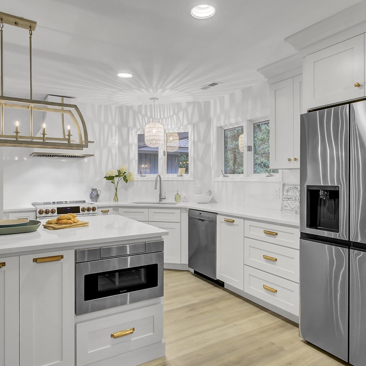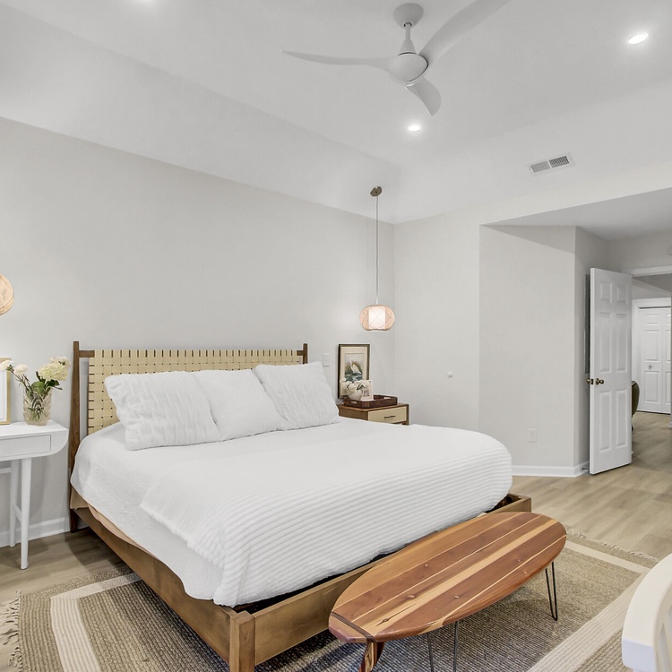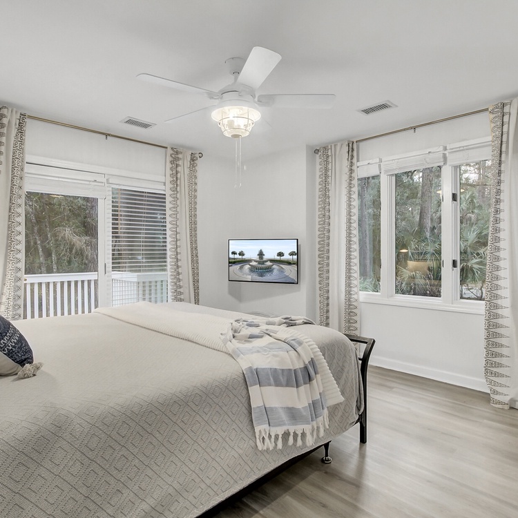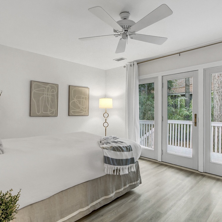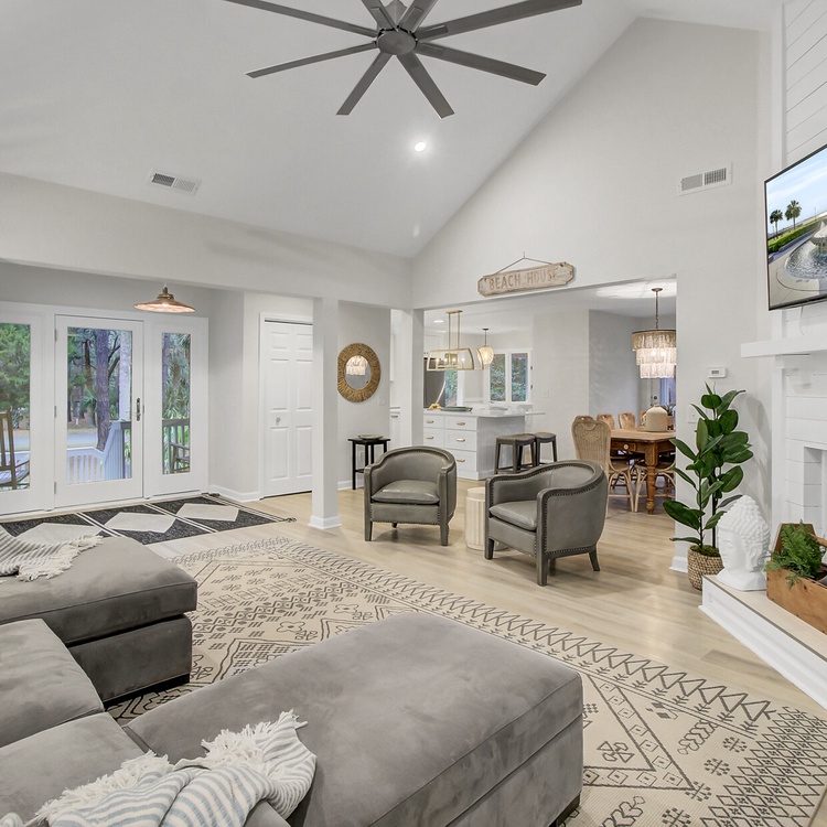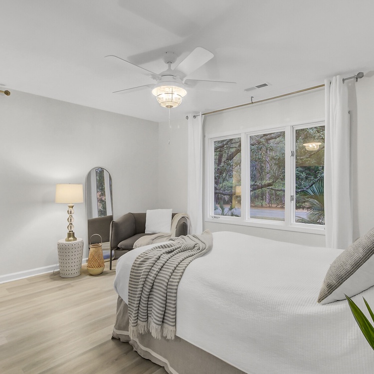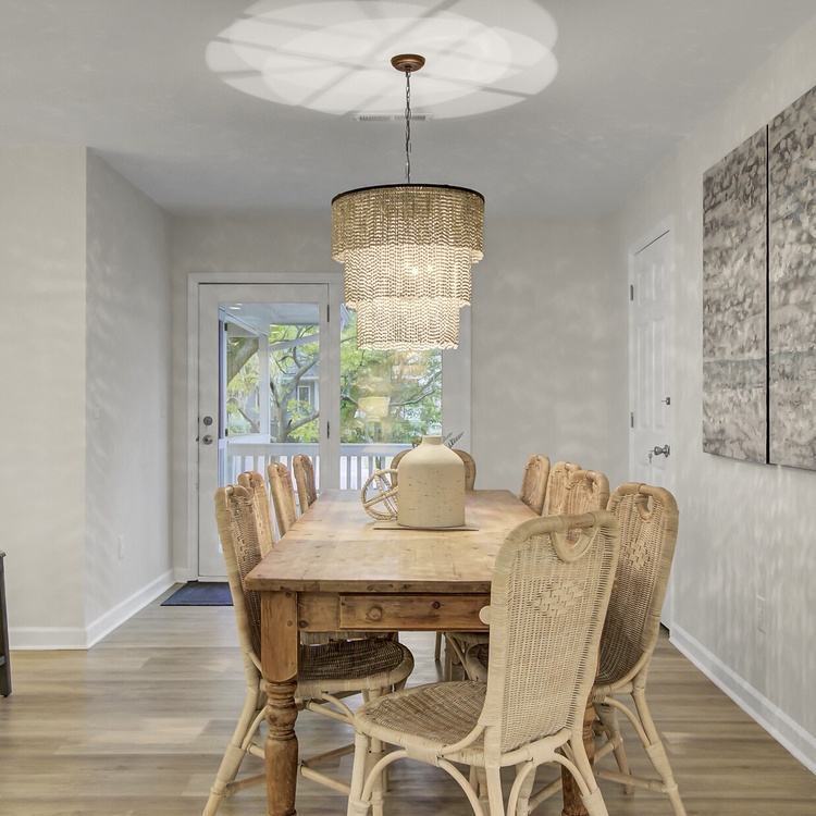 Settled in Vanderhorst Plantation, this one-story home has a calm and contemporary feel. In the living area, you will find a cozy couch, two comfortable chairs, and a TV. The fully equipped kitchen offers beautiful white cabinetry, a spacious center island, barstool seating as well as additional kitchen seating perfect for your morning coffee. The dining area is sure to please as it is in close proximity to the kitchen area and provides ample seating for your whole party.