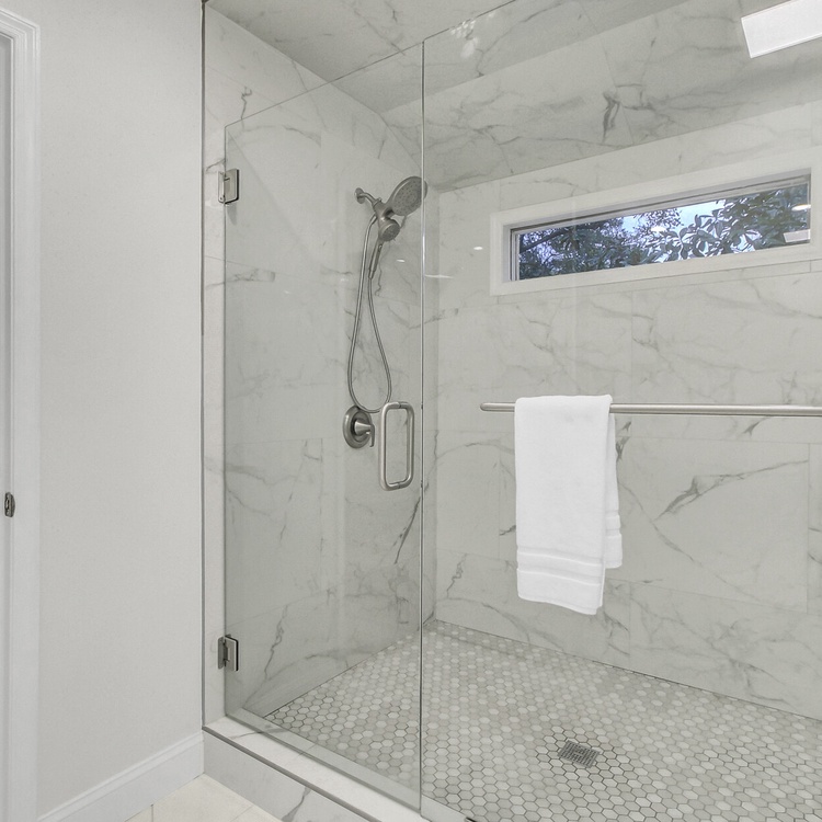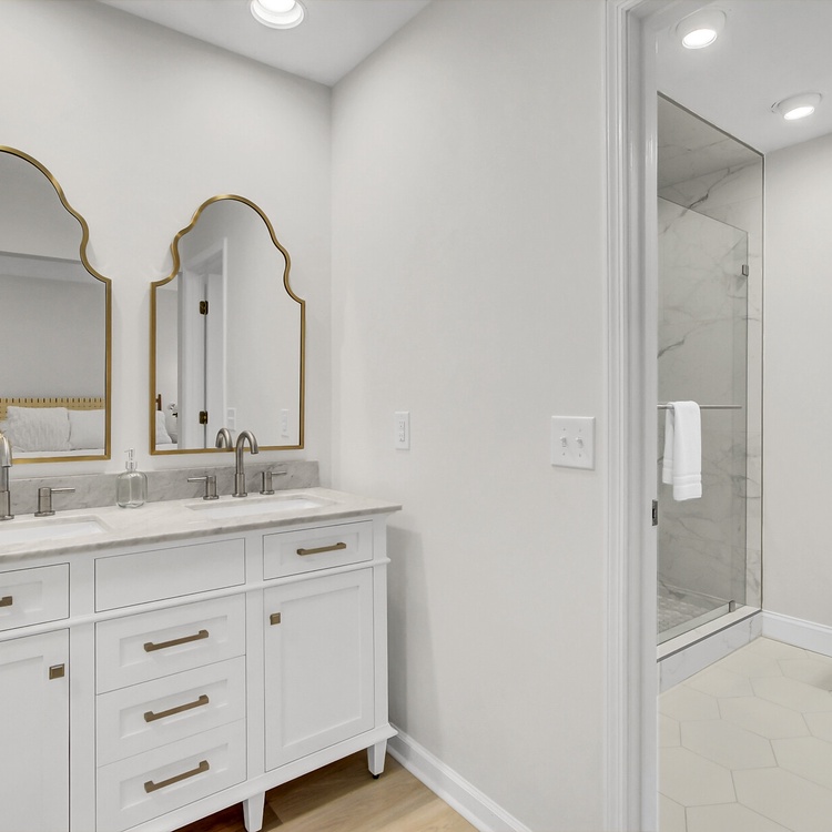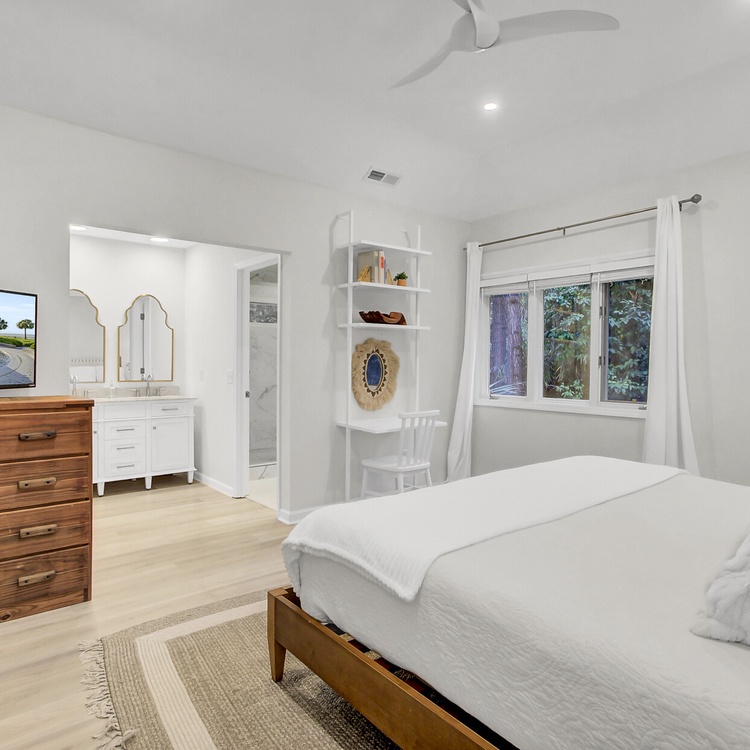 The primary bedroom offers a king-sized bed, a TV, ample closet space, and a private primary bathroom. The full bathroom features a double sink vanity and a glass walk-in shower.