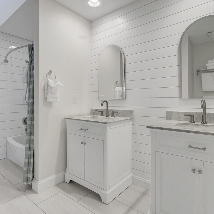 The fourth bedroom features a queen-sized bed, a TV, and deck access. Bedroom five also features a queen-sized bed and a TV. Both bedrooms have access to another full bathroom just down the hall. This full bathroom includes a double sink vanity and a shower and bathtub combination.