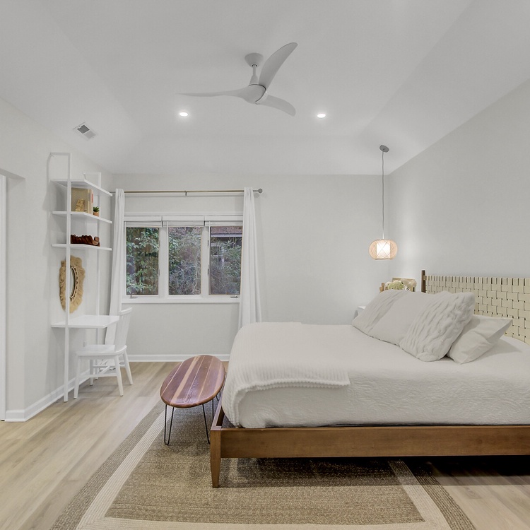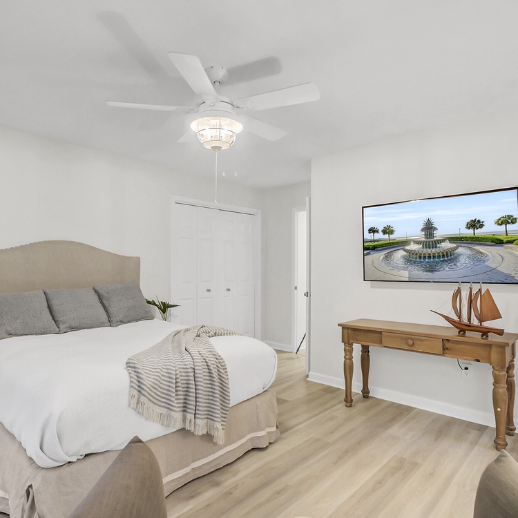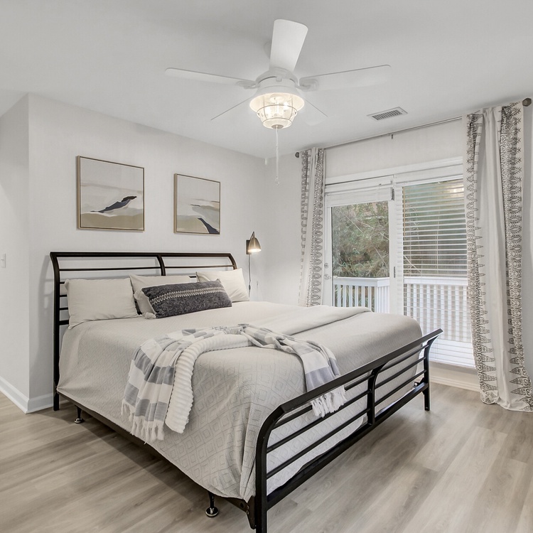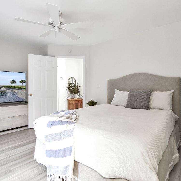 The secondary bedroom also offers a king-sized bed, a TV, and deck access. The third bedroom offers a king-sized bed and a TV. Both bedrooms have access to the full bathroom just down the hall. The full bathroom features a shower and bathtub combination.