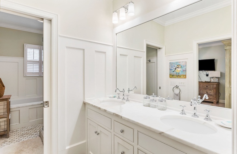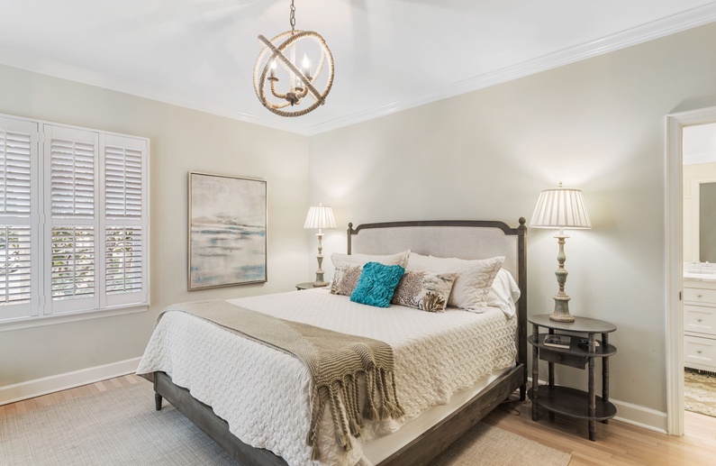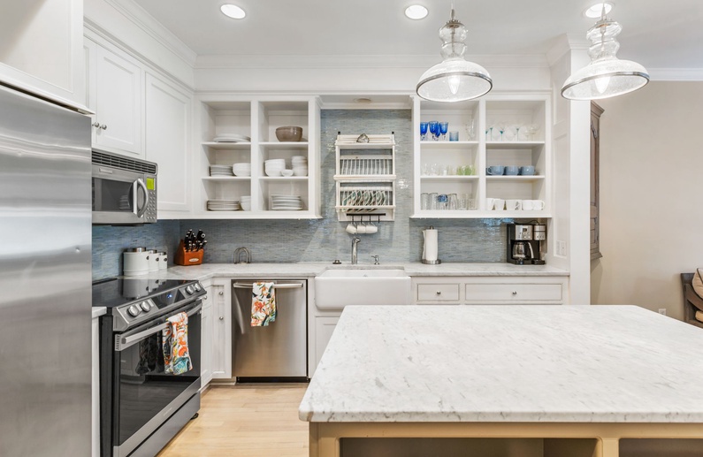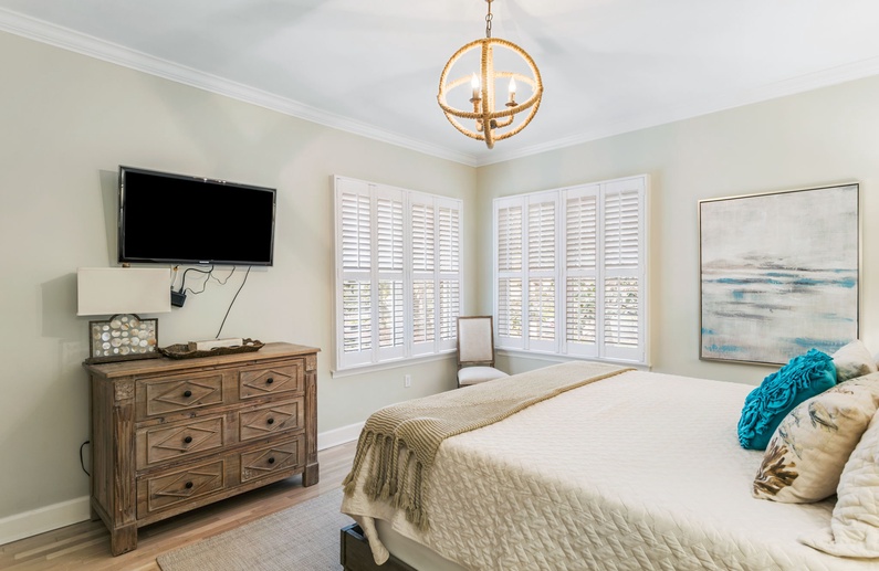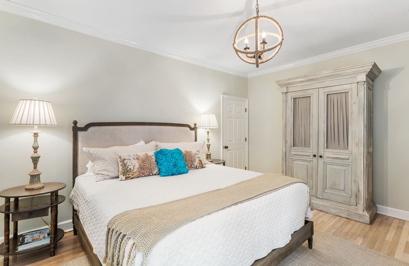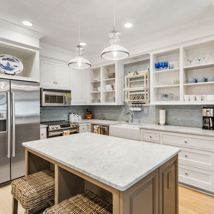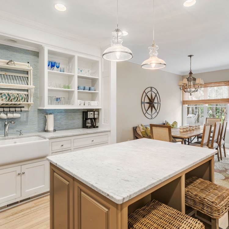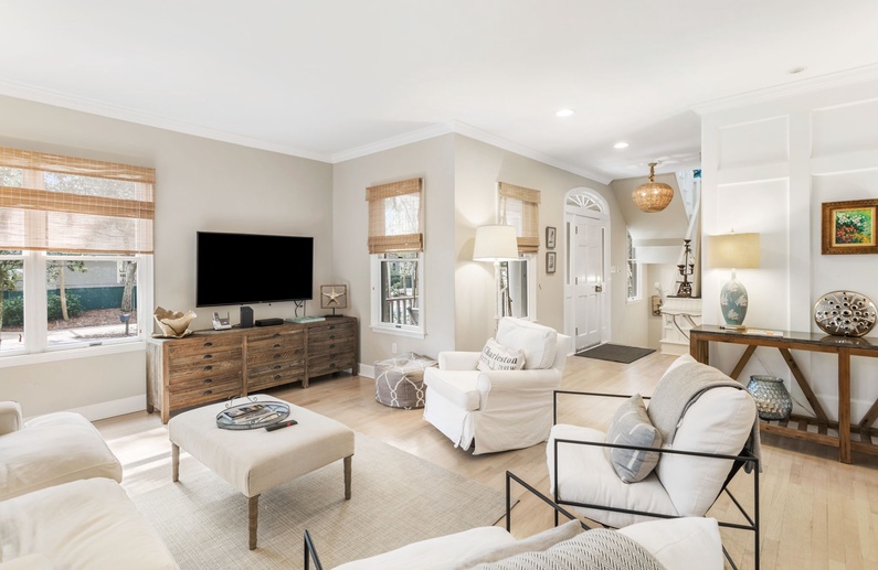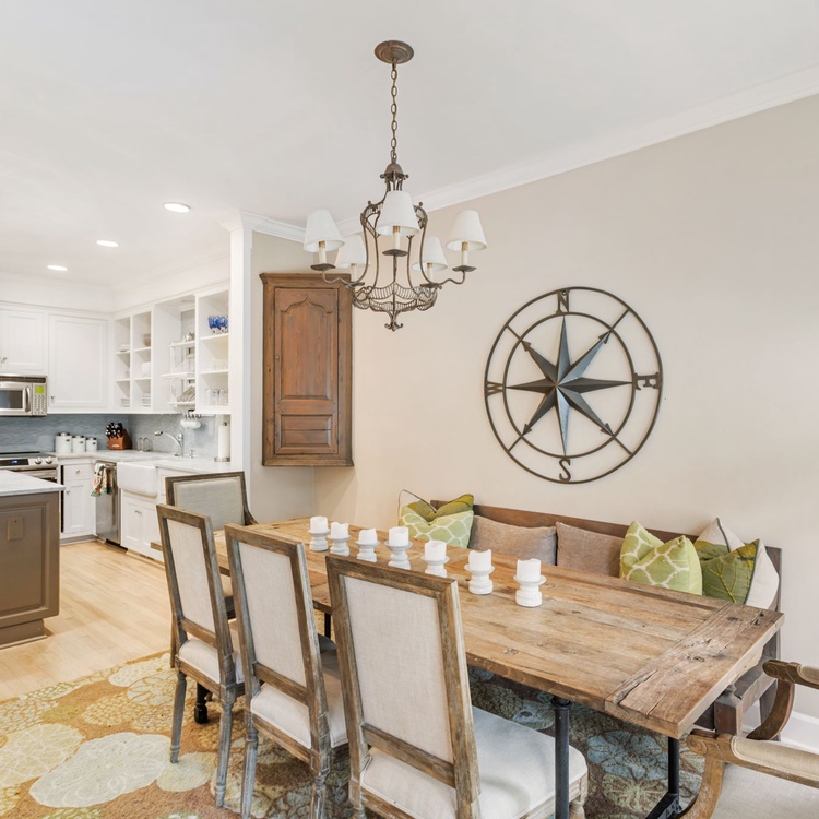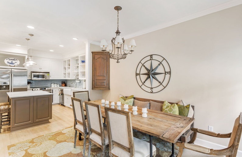 The semi-detached home exudes Southern charm with its double front porches, soothing color palette, coastal casual furnishings, and hardwood floors. The open and airy main floor allows easy flow between the living room, kitchen, and dining area. The living room offers comfortable seating, a large wall-mounted flat-screen TV, and access to the side deck. The dining area is open to the kitchen, featuring a long table with chairs and a bench seat. The light and bright kitchen is highlighted by white cabinetry, marble countertops, stainless steel appliances, a farmhouse apron sink, glass tile backsplash, and an island with bar stool seating.