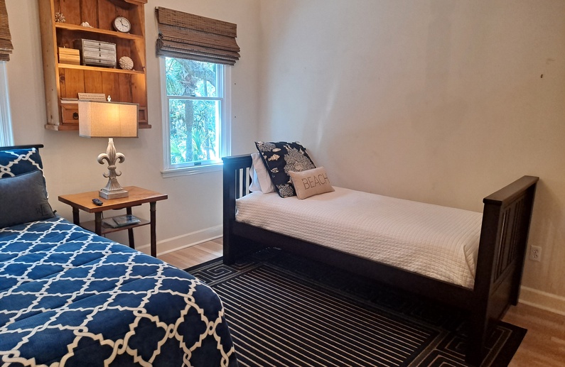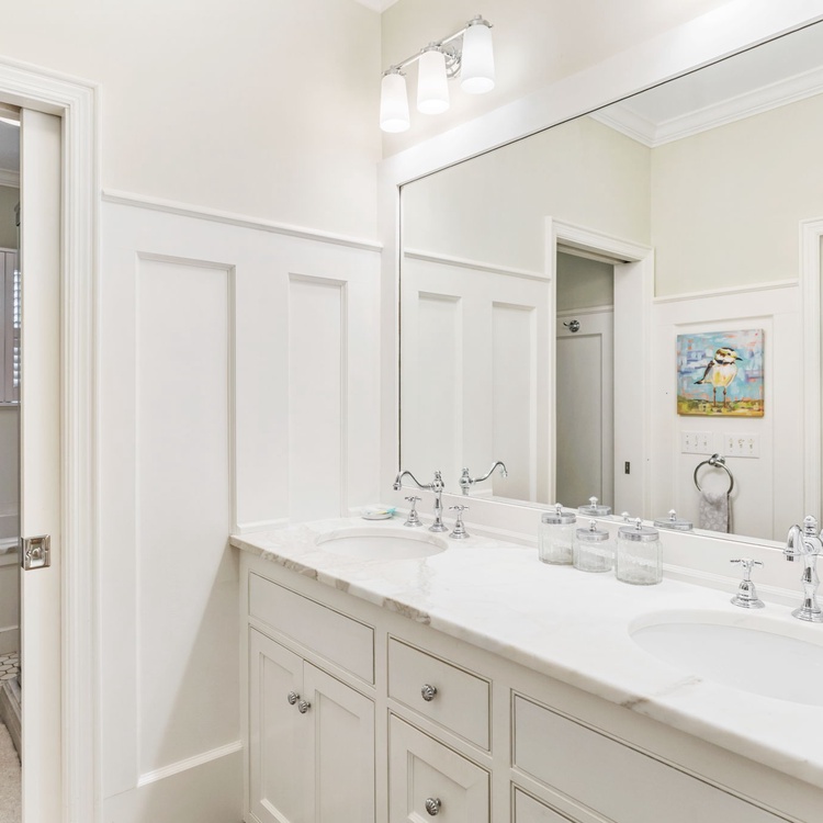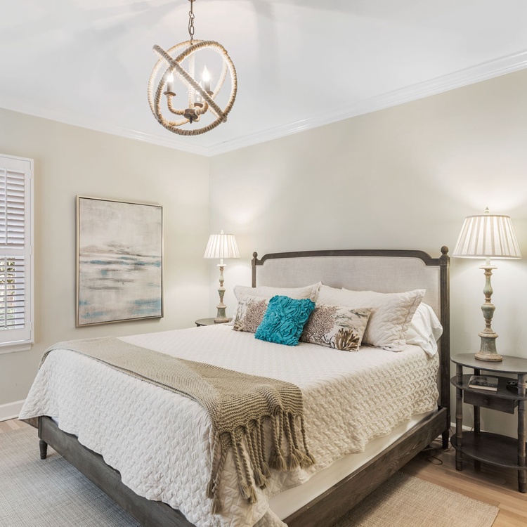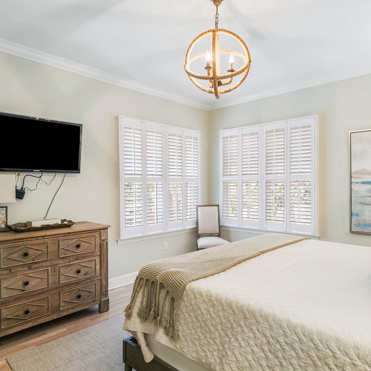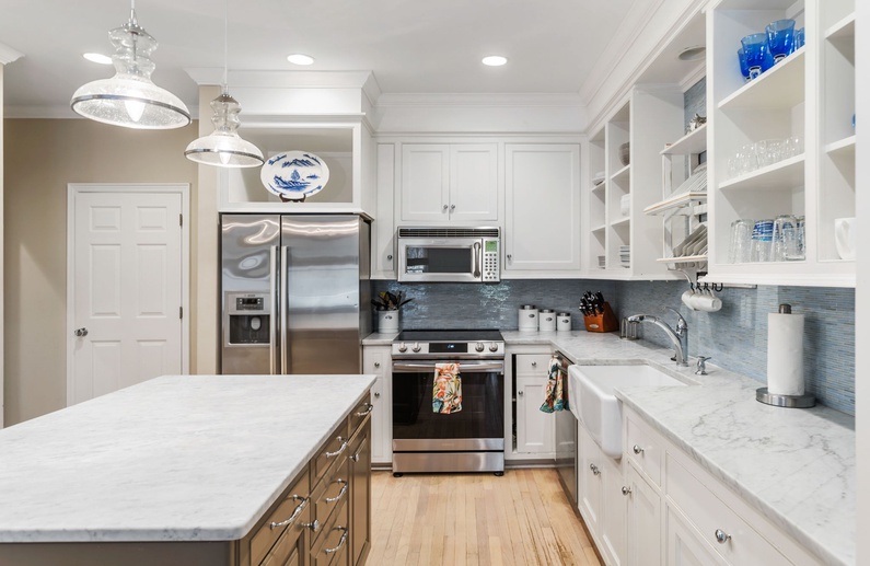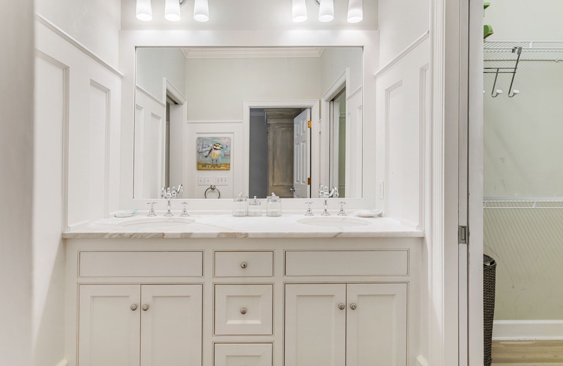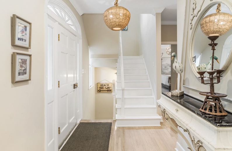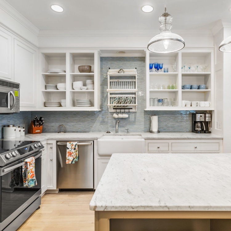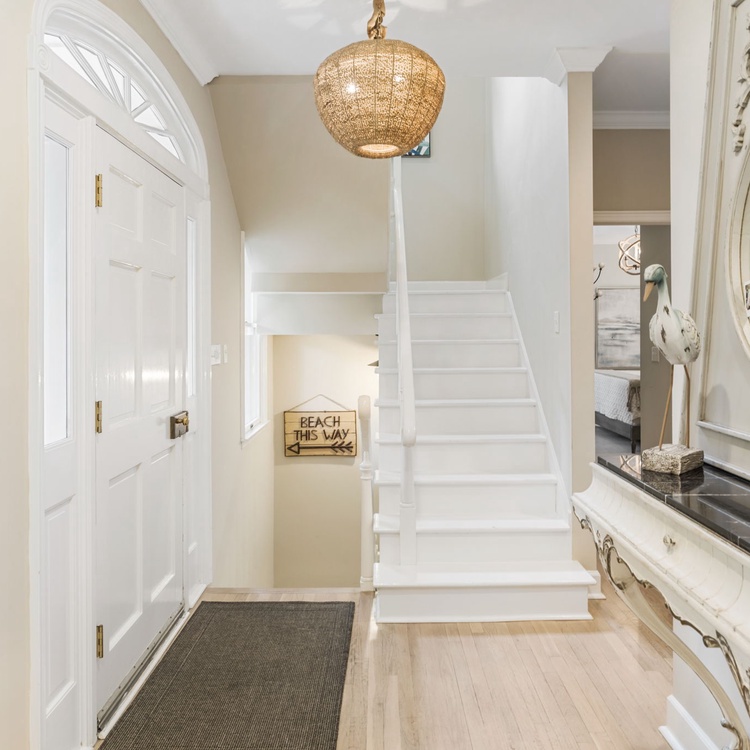 The semi-detached home exudes Southern charm with its double front porches, soothing color palette, coastal casual furnishings, and hardwood floors. The open and airy main floor allows easy flow between the living room, kitchen, and dining area. The living room offers comfortable seating, a large wall-mounted flat-screen TV, and access to the side deck. The dining area is open to the kitchen, featuring a long table with chairs and a bench seat. The light and bright kitchen is highlighted by white cabinetry, marble countertops, stainless steel appliances, a farmhouse apron sink, glass tile backsplash, and an island with bar stool seating.
