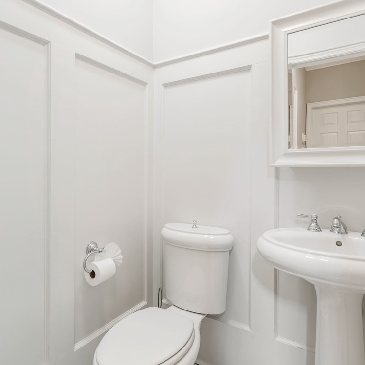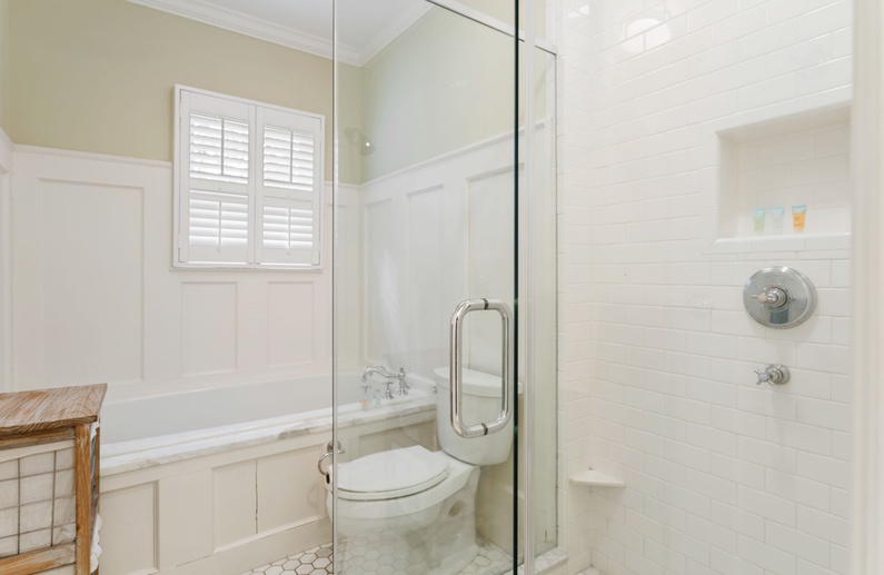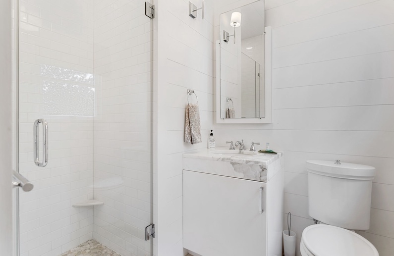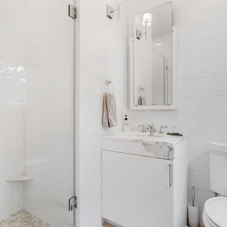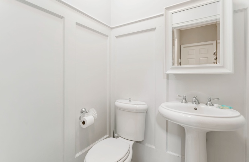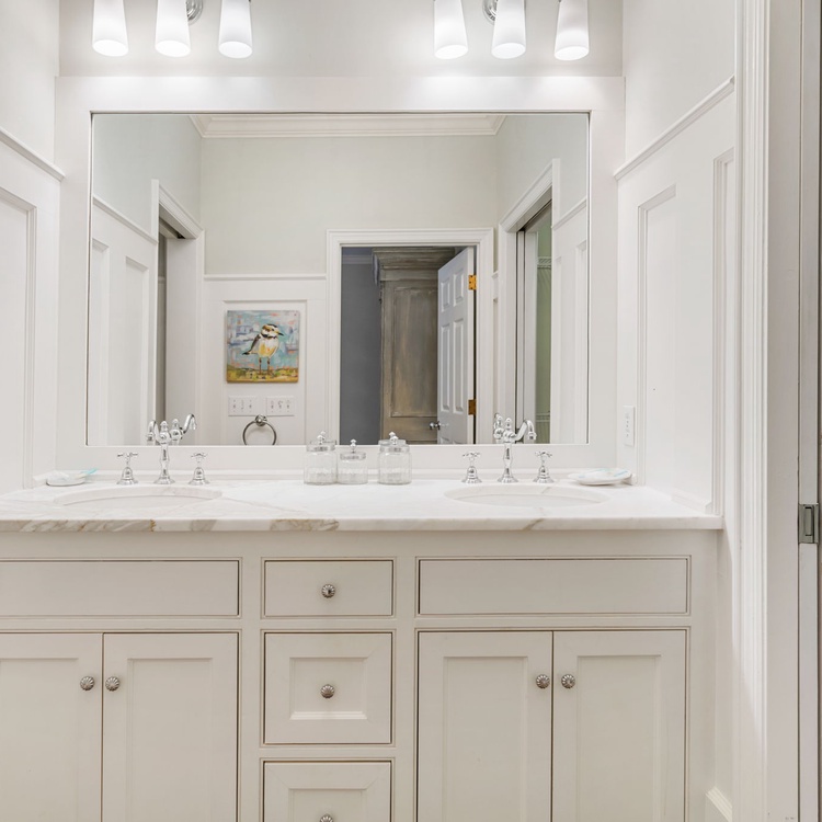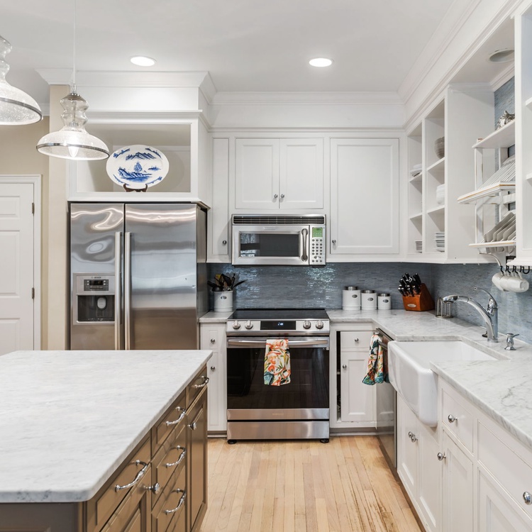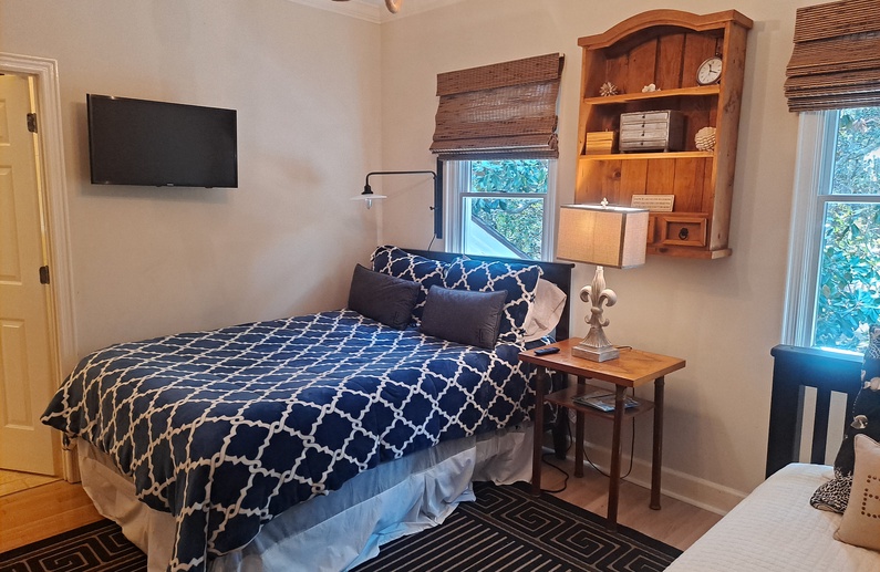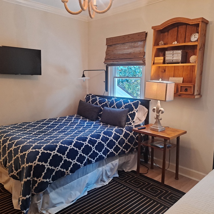 The semi-detached home exudes Southern charm with its double front porches, soothing color palette, coastal casual furnishings, and hardwood floors. The open and airy main floor allows easy flow between the living room, kitchen, and dining area. The living room offers comfortable seating, a large wall-mounted flat-screen TV, and access to the side deck. The dining area is open to the kitchen, featuring a long table with chairs and a bench seat. The light and bright kitchen is highlighted by white cabinetry, marble countertops, stainless steel appliances, a farmhouse apron sink, glass tile backsplash, and an island with bar stool seating.