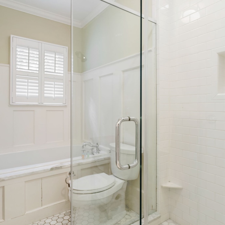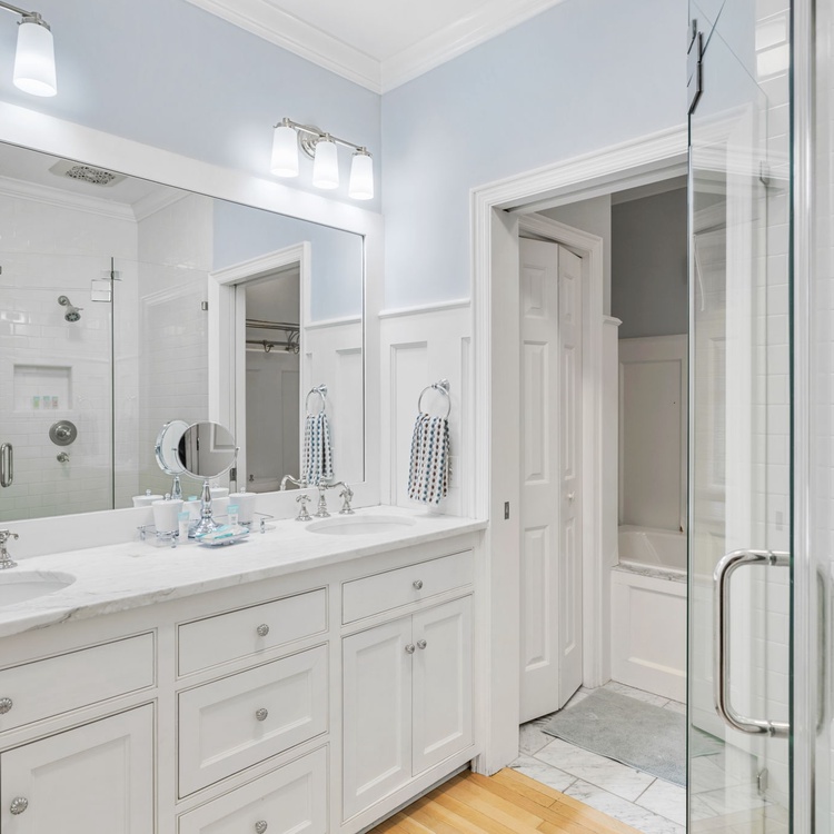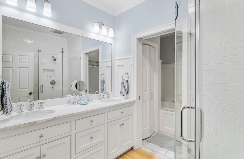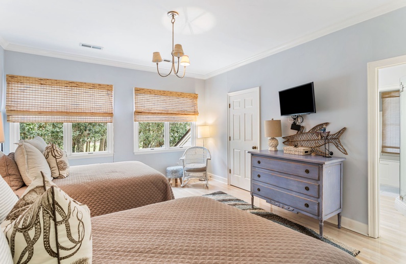 The primary suite is located on the main floor and offers a king-sized bed, wall-mounted flat-screen TV, and private bathroom with double sinks and separate bathtub and shower. Two additional bedrooms and bathrooms occupy the second floor. The first bedroom features two queen beds, wall-mounted flat-screen TV, and private bathroom with double sinks and separate bathtub and shower. Another bedroom offers one queen bed and twin-XL bed, wall-mounted flat-screen TV, and bathroom with shower.
