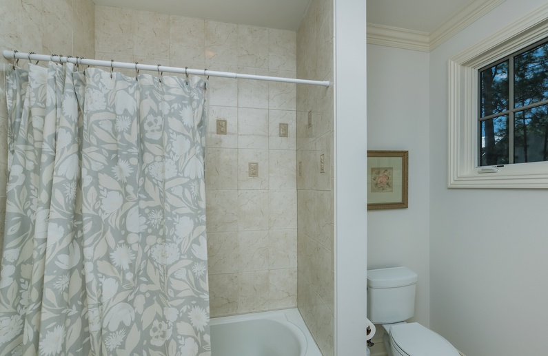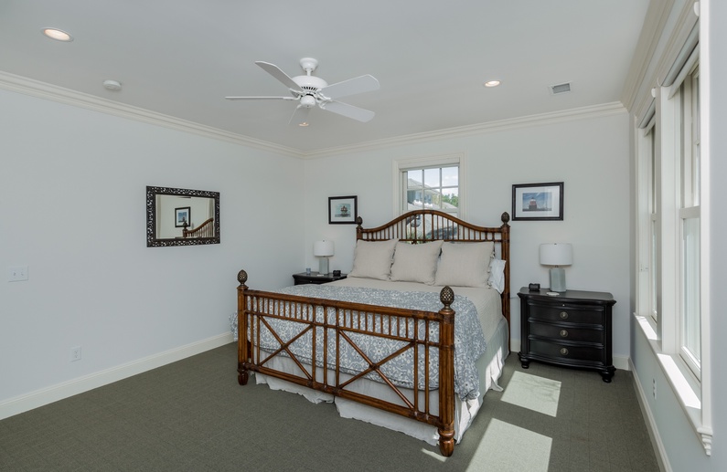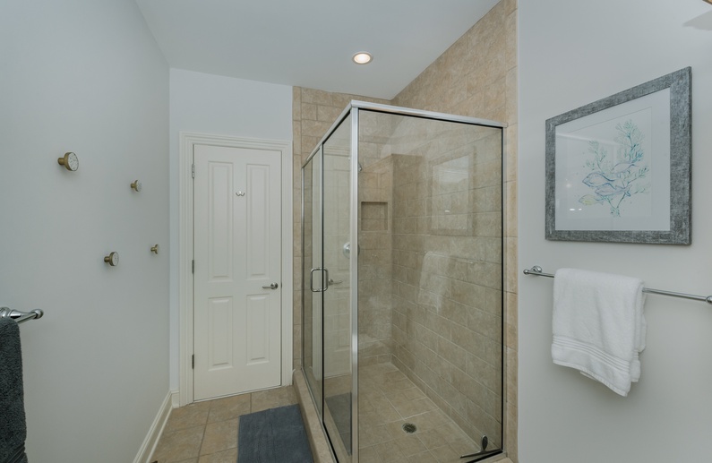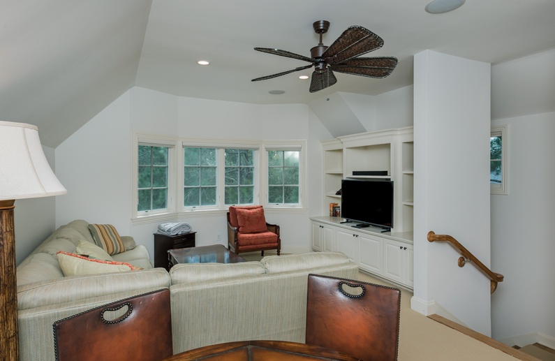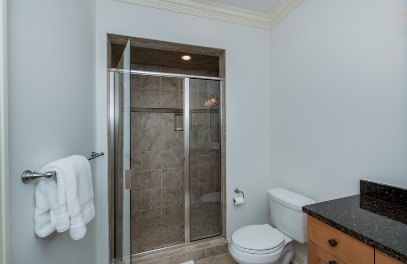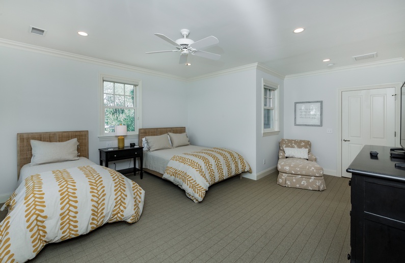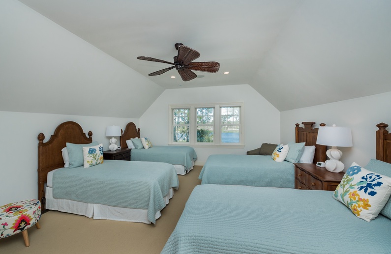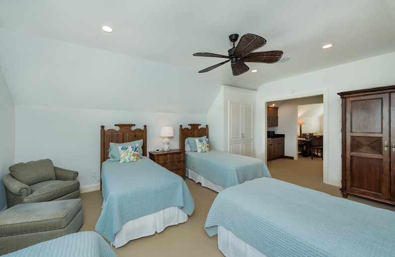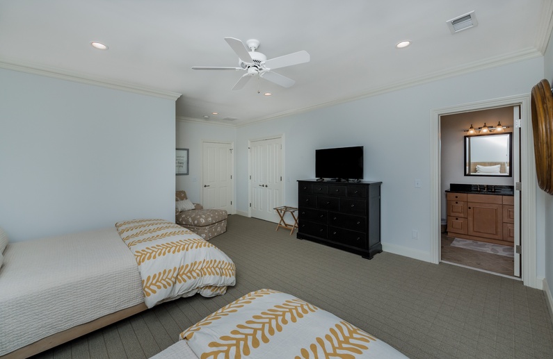 The first-floor primary suite features a king-sized bed, TV, and private bathroom. Upstairs, you’ll find a secondary suite with king bed and private bathroom. Two additional bedrooms, also with private bathrooms, are down the hall. The bedroom to left offers a full-sized bed and twin bed. To the right, you will find the 3rd king bedroom. On the third floor, the fifth bedroom contains 4 twin beds, a private bathroom, and a second living area. This is a great spot to let kids or teens have their own space.