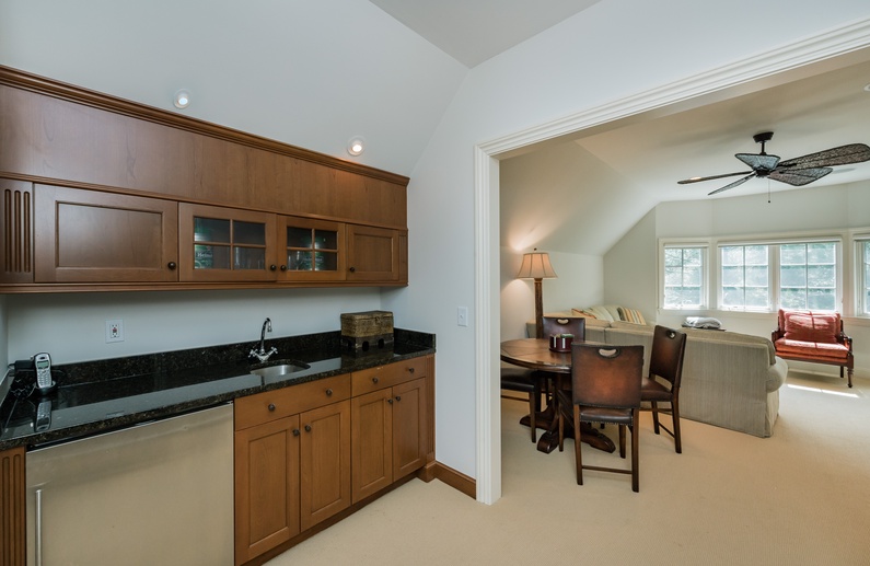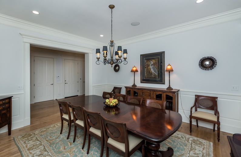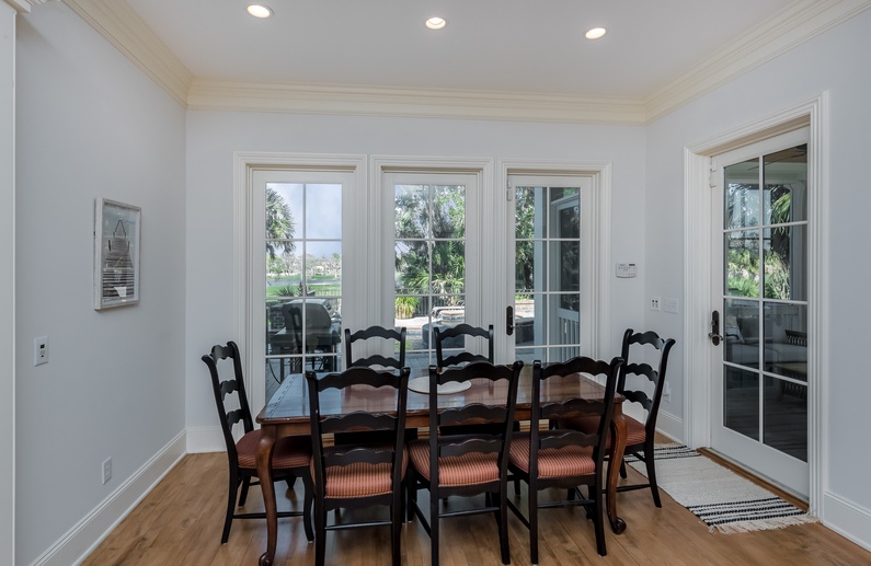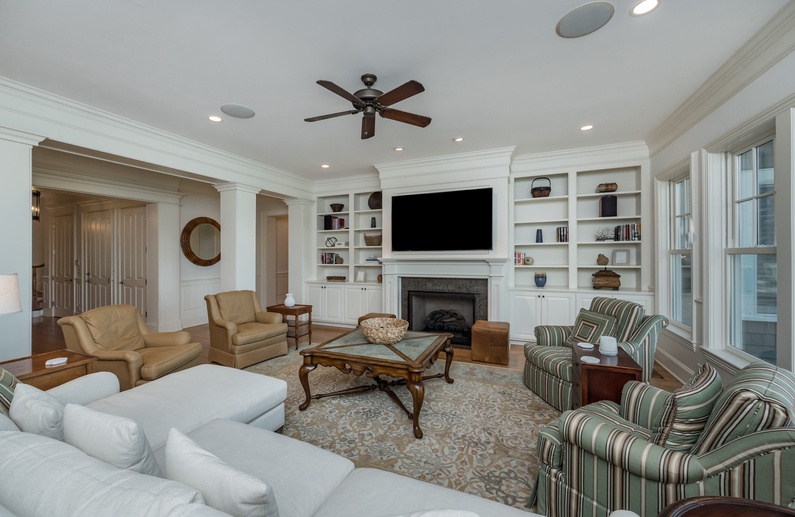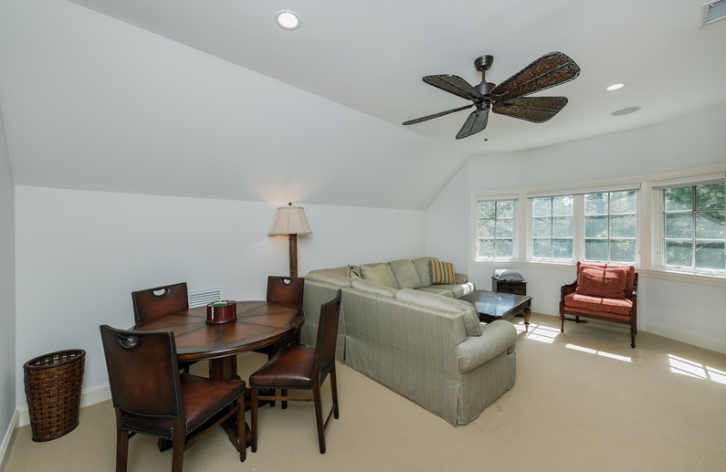 The main living space is ideal for large families with a comfortable couch, plenty of chairs, TV, and access to the back deck. The fully equipped kitchen features granite countertops, vast cabinet space, stainless steel appliances, and an island with 3 barstools. Adjacent to the kitchen is the sunny eat-in area with a table and chairs that seat 8. The dining room also has a table and chairs that seat 10 that is perfect for family meals while on vacation. Guests can enjoy extra living space in the den.