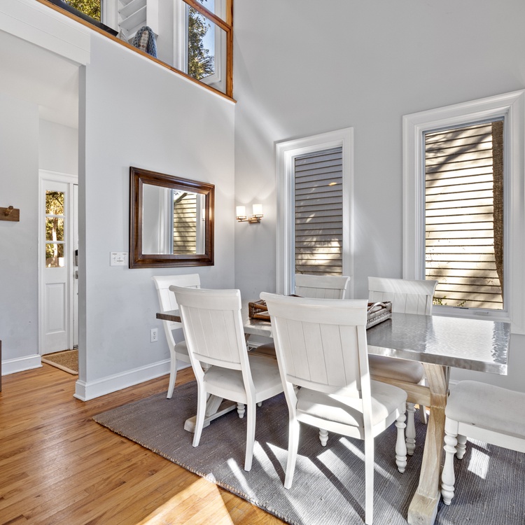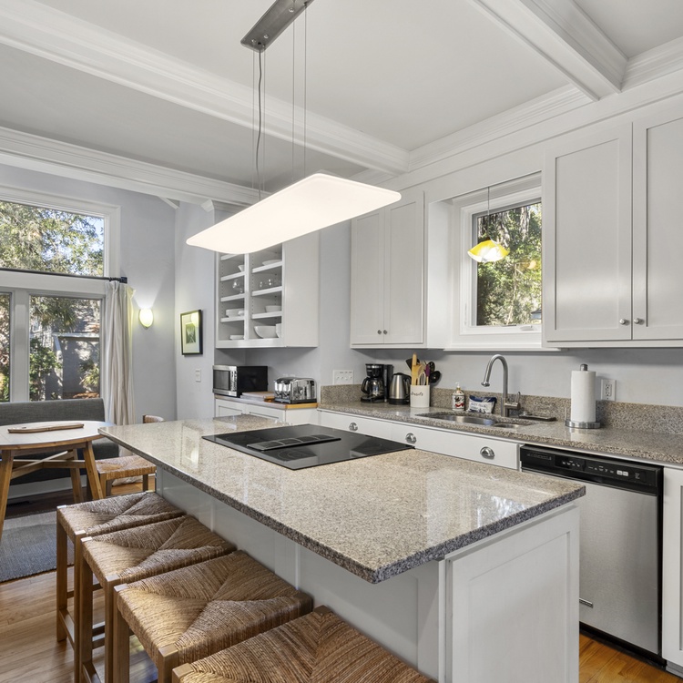 The cozy main living area offers two sofas, two chairs, mounted flat-screen TV, and access to the back deck. The fully equipped kitchen has white cabinets, plenty of counter space, an island with 2 bar stools, and stainless-steel appliances. Enjoy meals at the table right off the kitchen or the formal dining table off the living room.