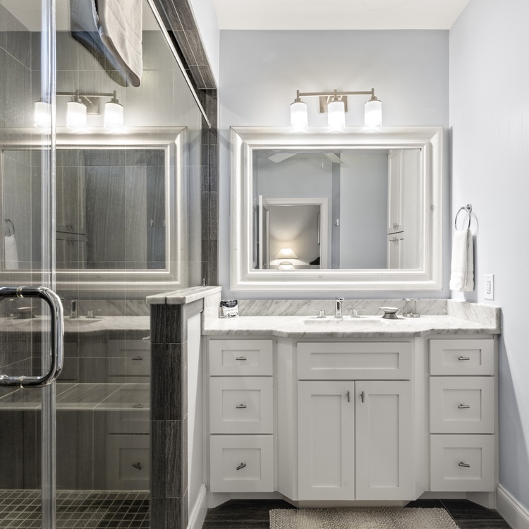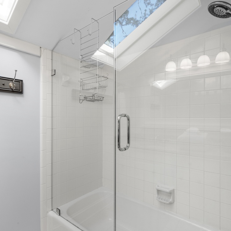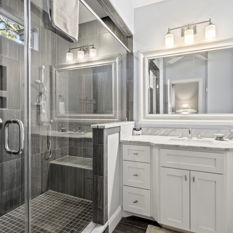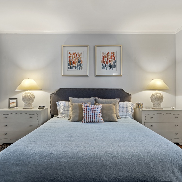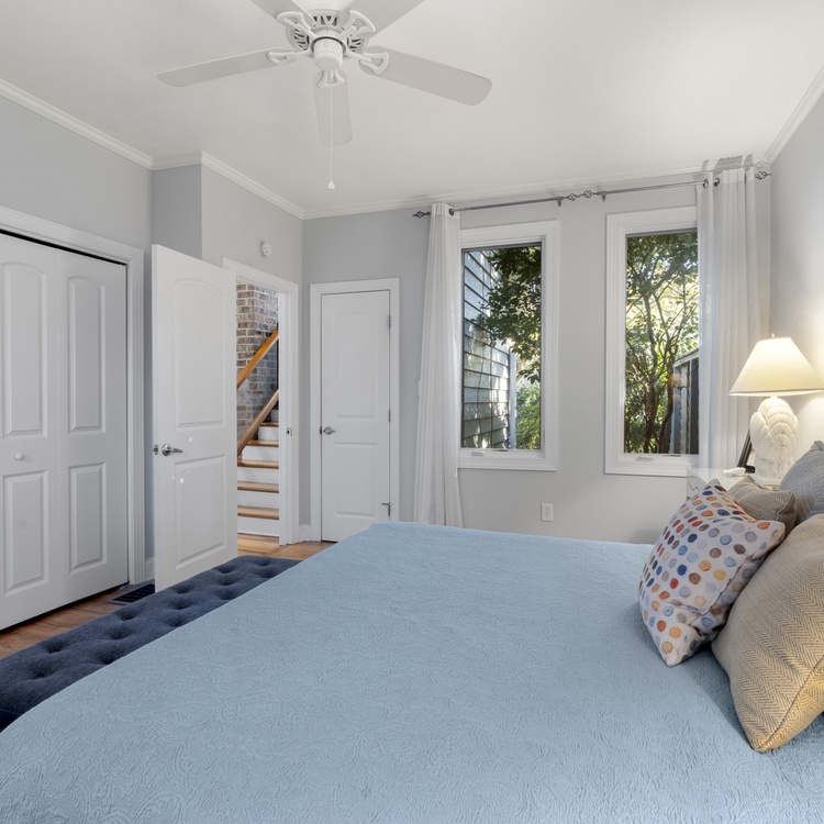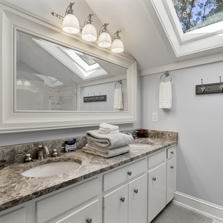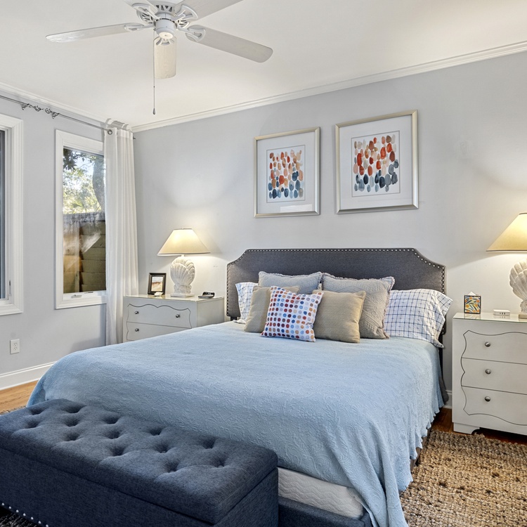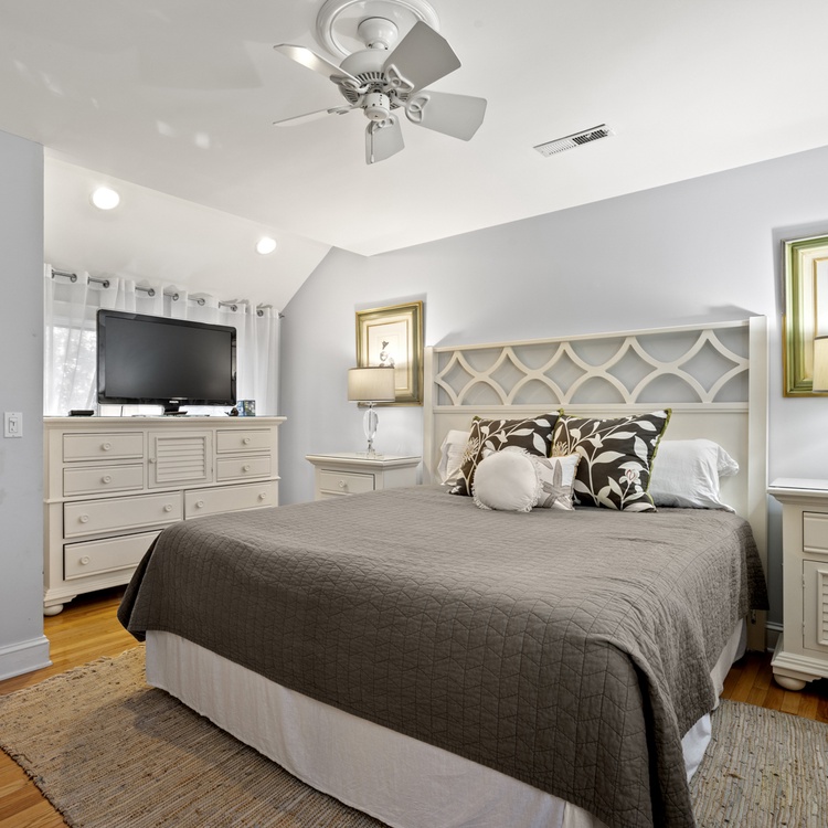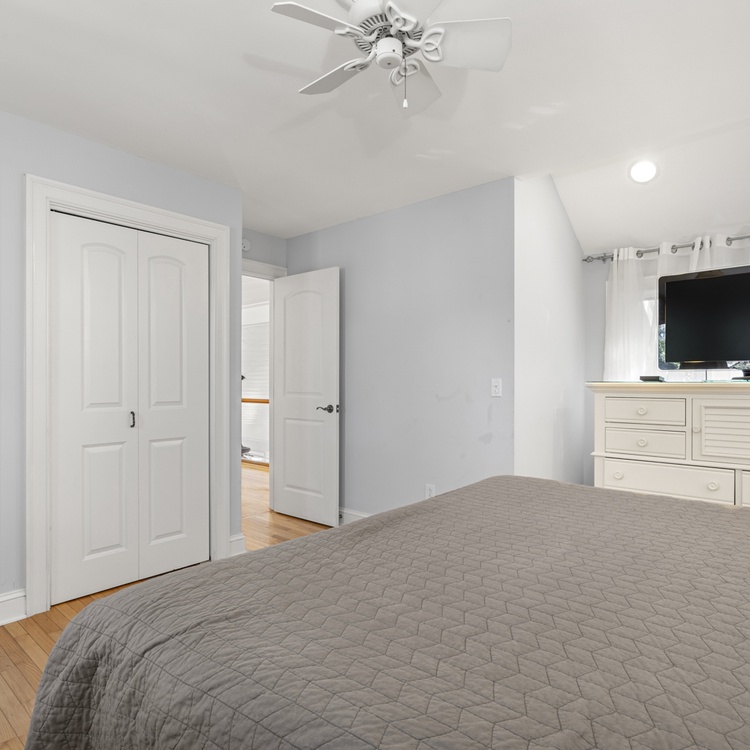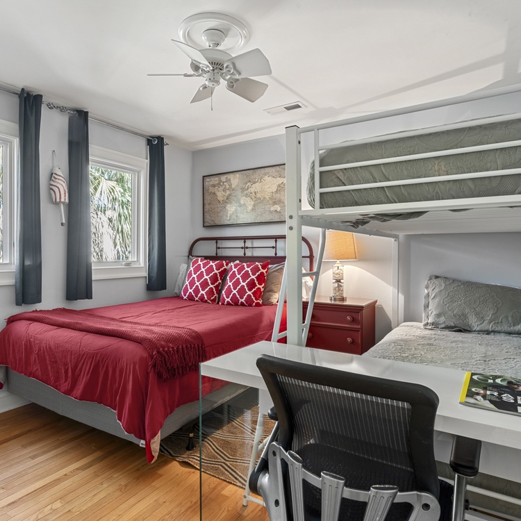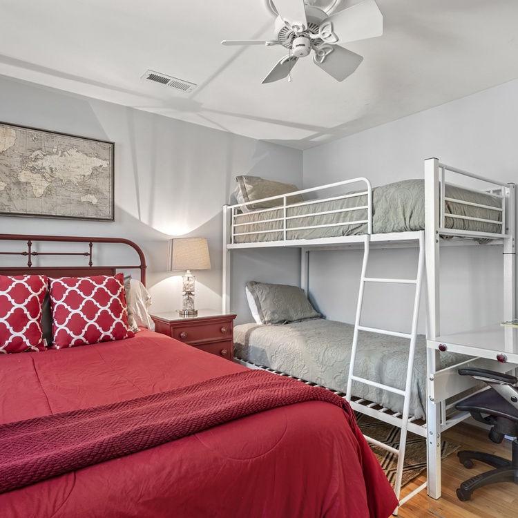 The first-floor primary bedroom has a king-sized bed and a private bathroom with a large walk-in shower and bench. Ascend the stairs and you will find two other bedrooms. One bedroom features a king bed and a flat-screen TV while the other has a full bed and twin over twin bunk bed. These bedrooms share a hall bathroom with two sinks and a shower/tub combo.