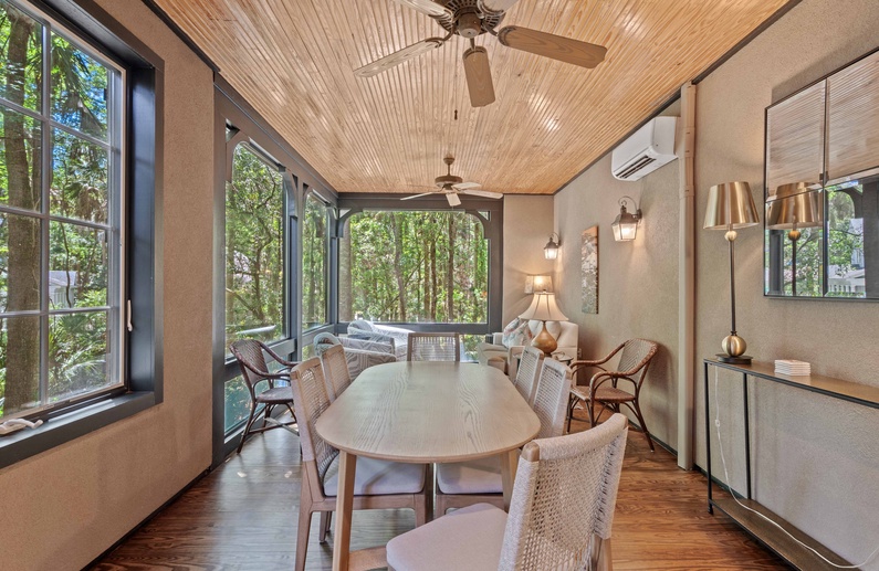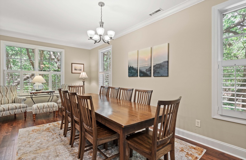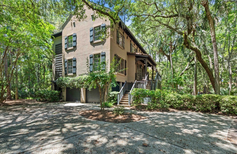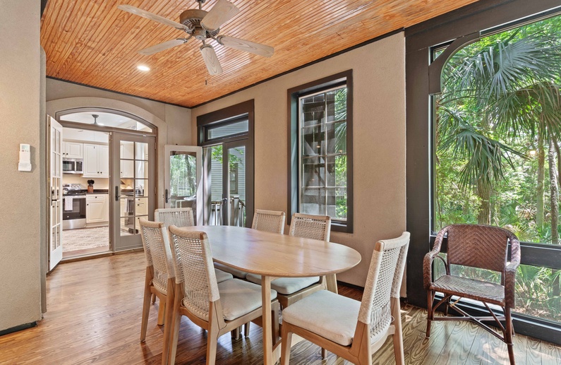 This Kiawah Island vacation rental, located in a quiet cul-de-sac past the second gate, features 5 bedrooms, 2 sunrooms, open living areas, and lovely wooded views. The home is about a 7-minute walk to the beach.