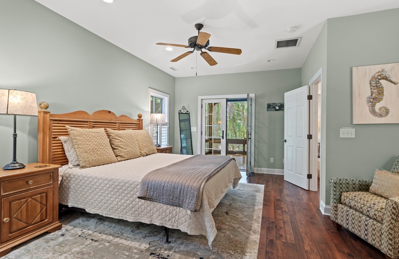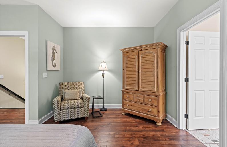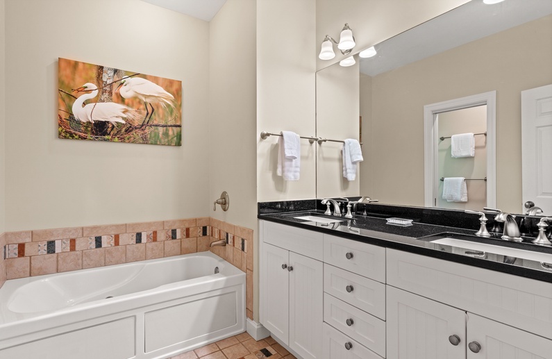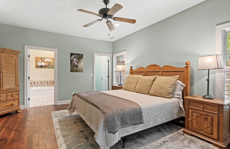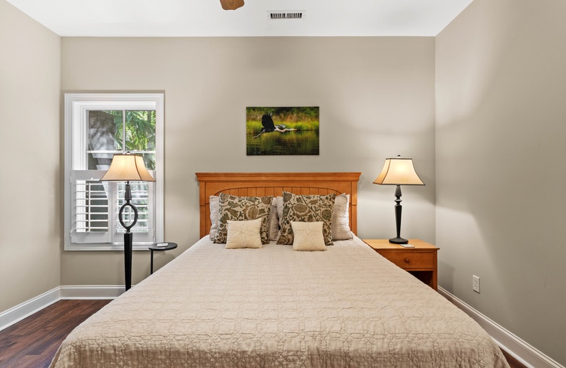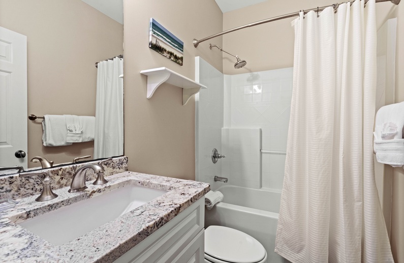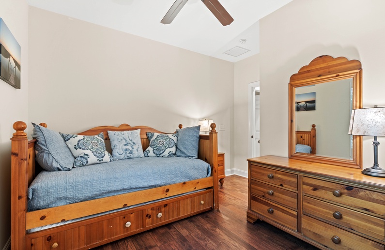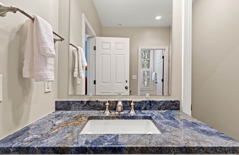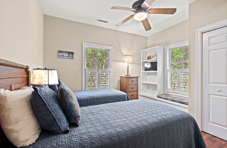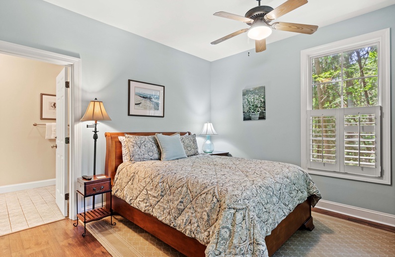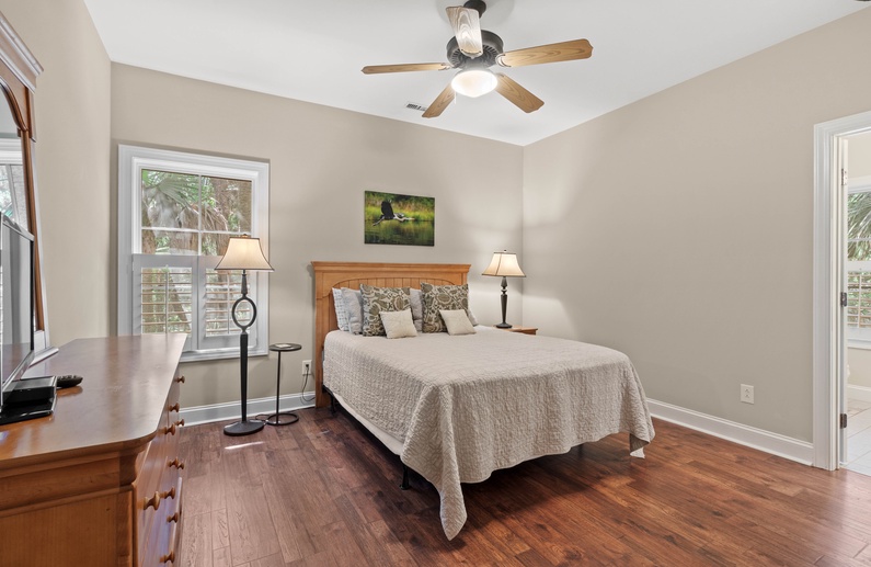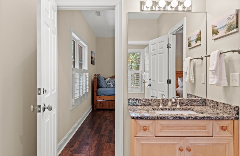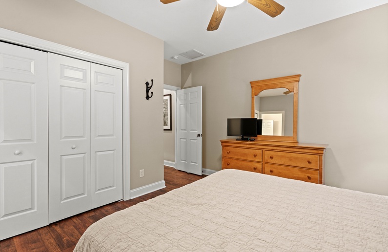 Upstairs, you will find 4 of the home’s 5 bedrooms. The primary suite has a king-sized bed and private access to a lovely sunroom. The en suite bathroom has a jetted tub, walk-in shower, and double sink vanity. The upstairs queen bedroom has a small flat-screen TV and shares a bathroom with the twin daybed/trundle room. This bathroom separates the two bedrooms and has a shower/tub combo. The final upstairs bedroom has two twin beds, a small TV, and is very close to a hall bathroom with a shower/tub combo. The fifth bedroom, located on the main floor, has a queen bed, TV, and entry to the downstairs hall bathroom with a shower/tub combo.