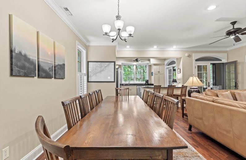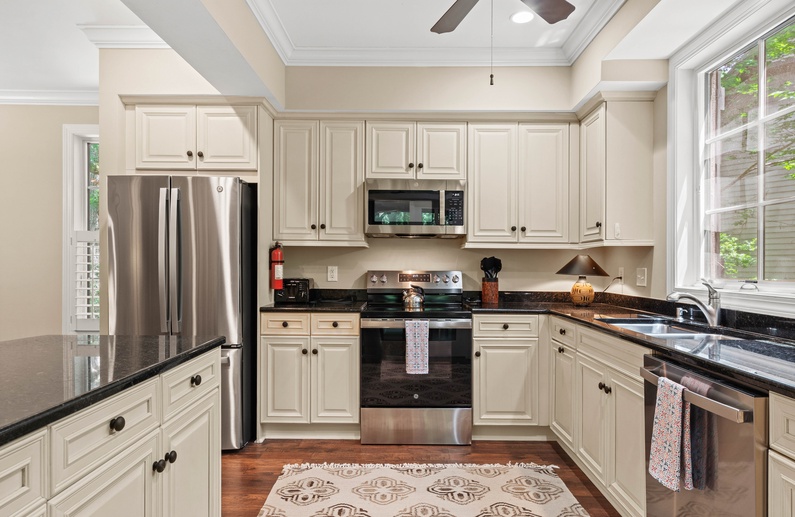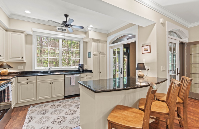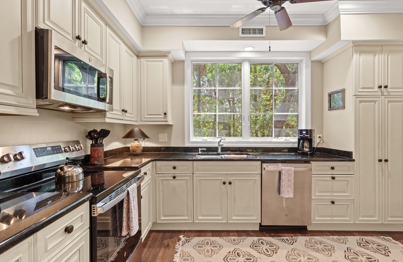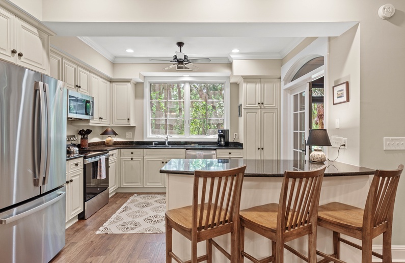 Enjoy gathering in the living room where you’ll find two comfortable sofas and an accent chair, a flat-screen TV, and access to the first-floor sunroom. The nearby dining area has seating for 10 at a long wood table. The kitchen also offers additional seating for 3 at the breakfast bar and everything you will need to prepare your vacation meals. It features beautiful cream cabinetry, black appliances, and plenty of counter space. A cozy retreat with serene views of the woods, the first-floor sunroom has a glass-top table with plenty of chairs and a loveseat.