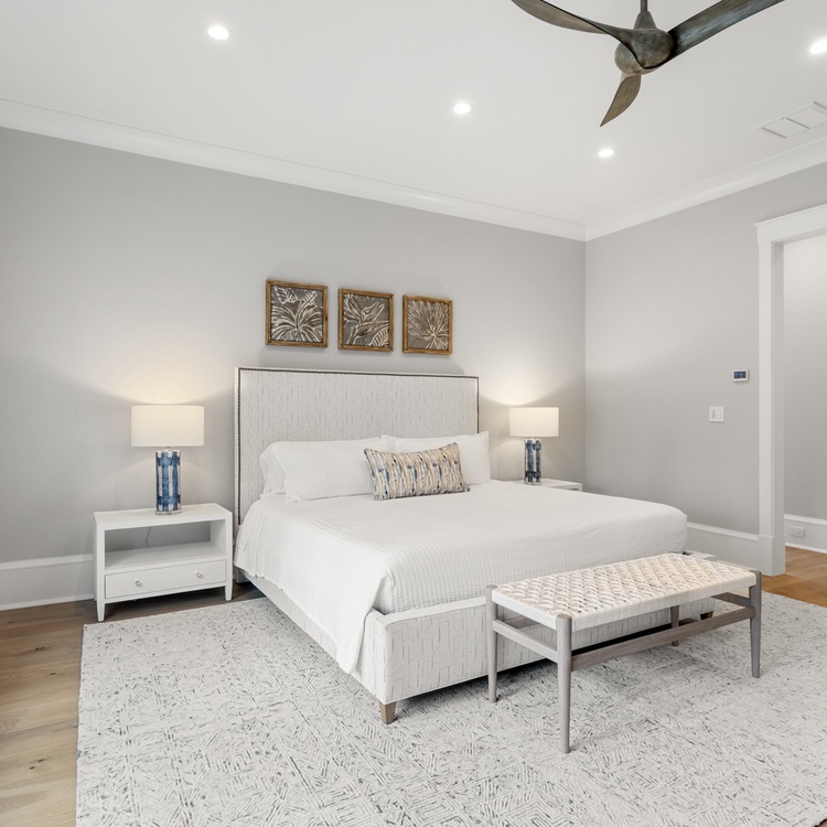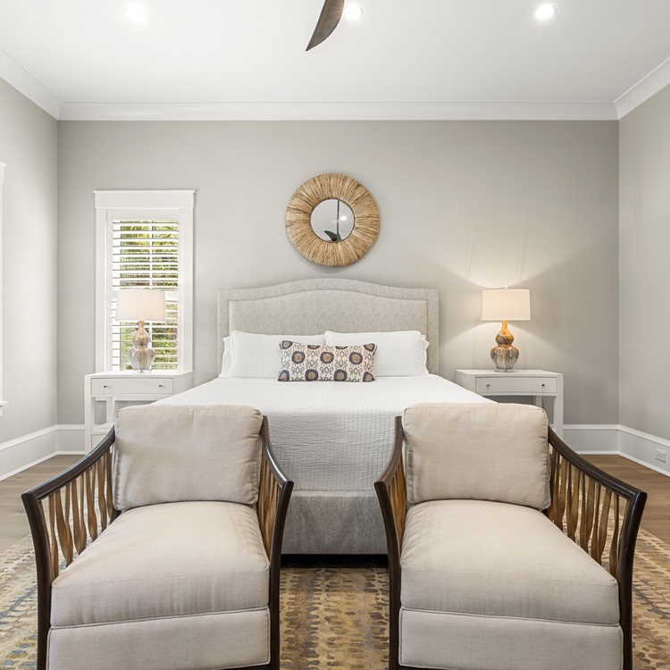 The second floor features 3 bedrooms all with king-sized beds, additional seating, and private walk-in showers.