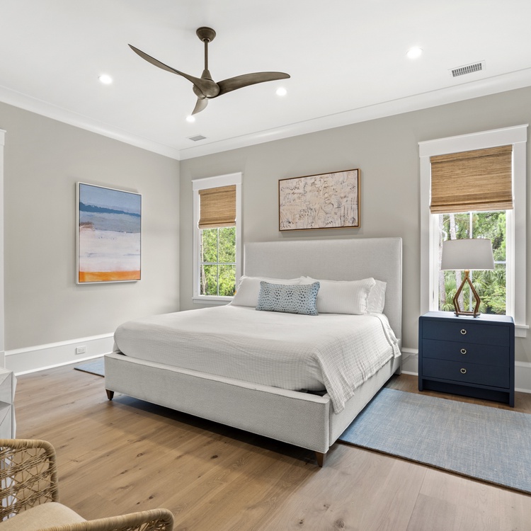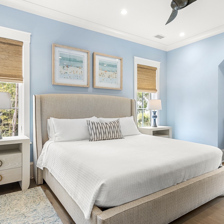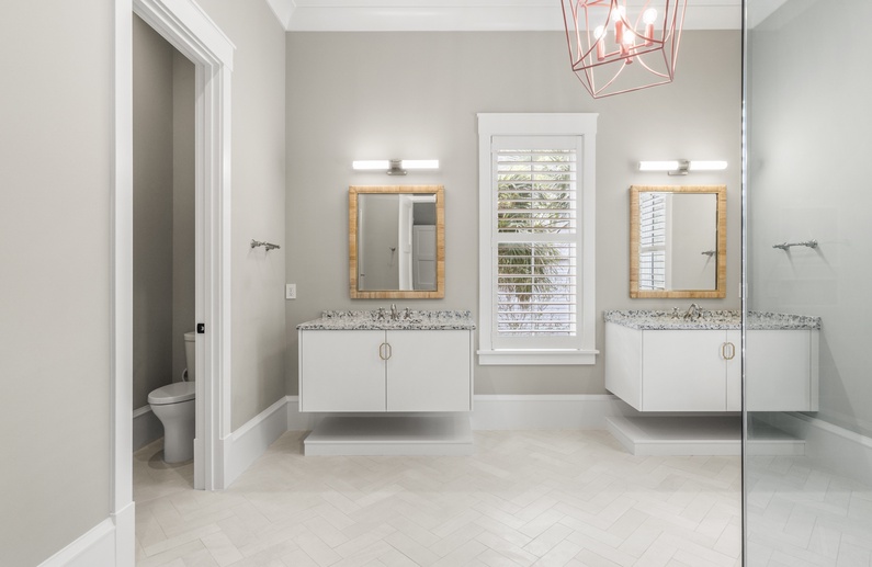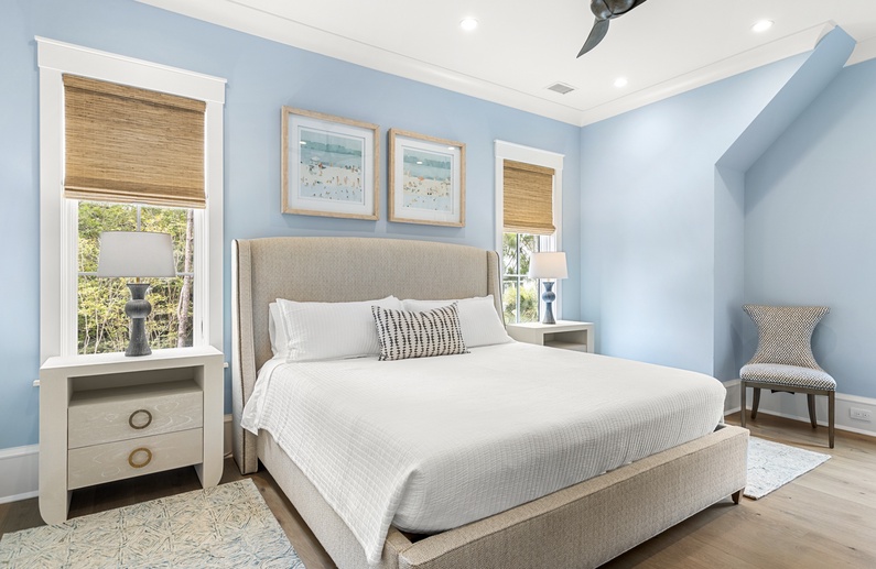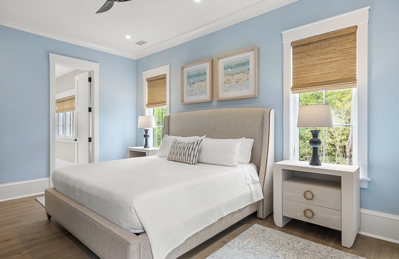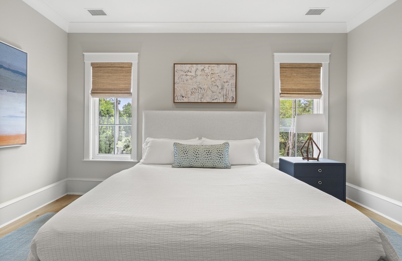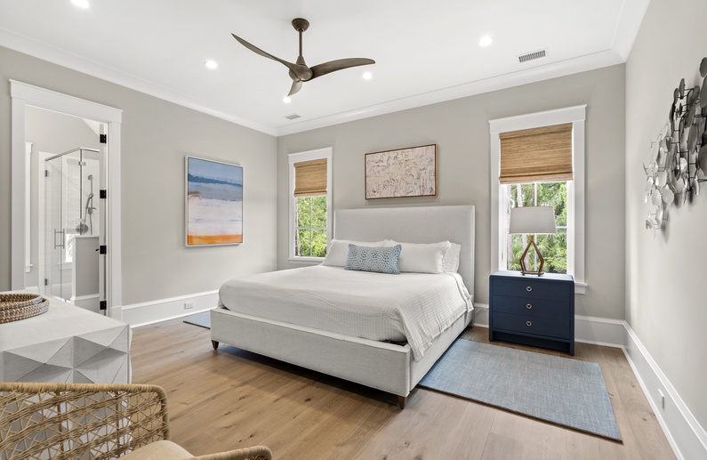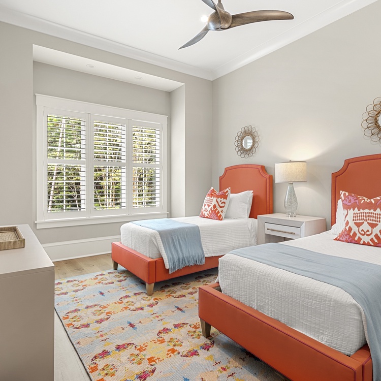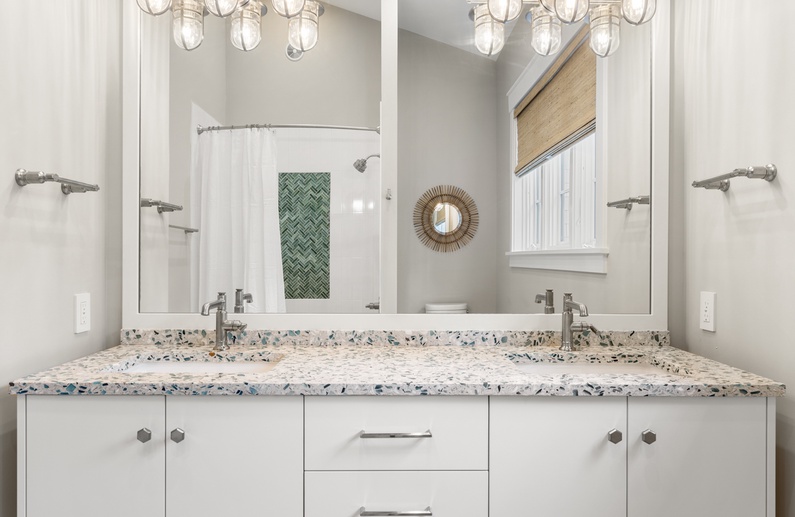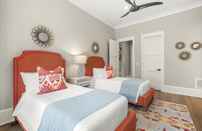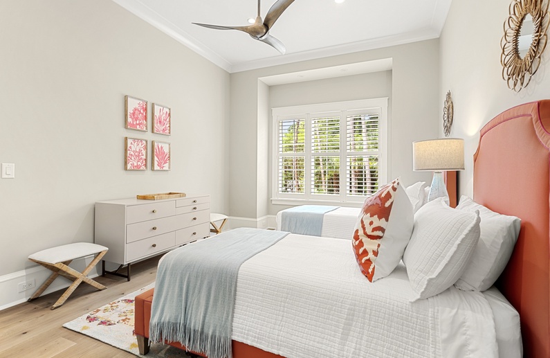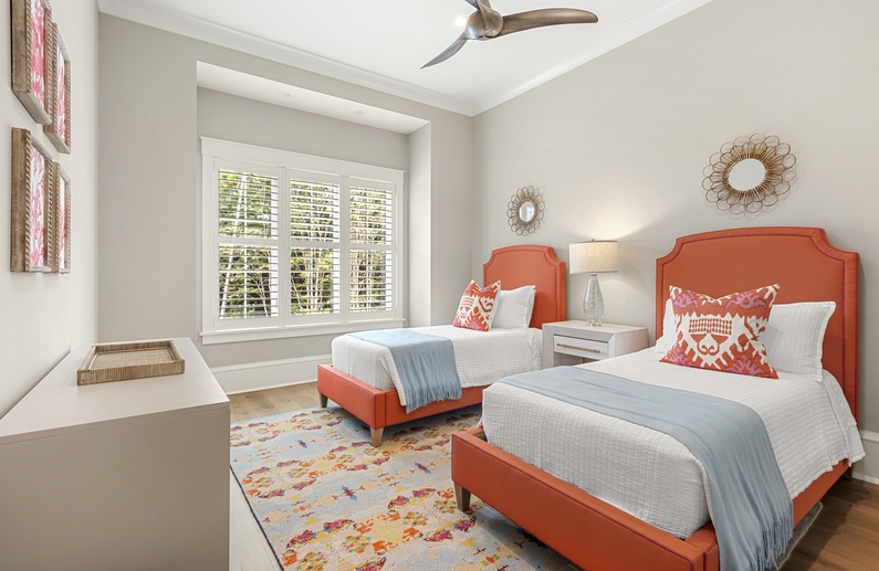 The secondary bedroom is also found on the first floor and features two twin-sized beds and access to a private, secondary bathroom with his and her sinks and a walk-in shower.
