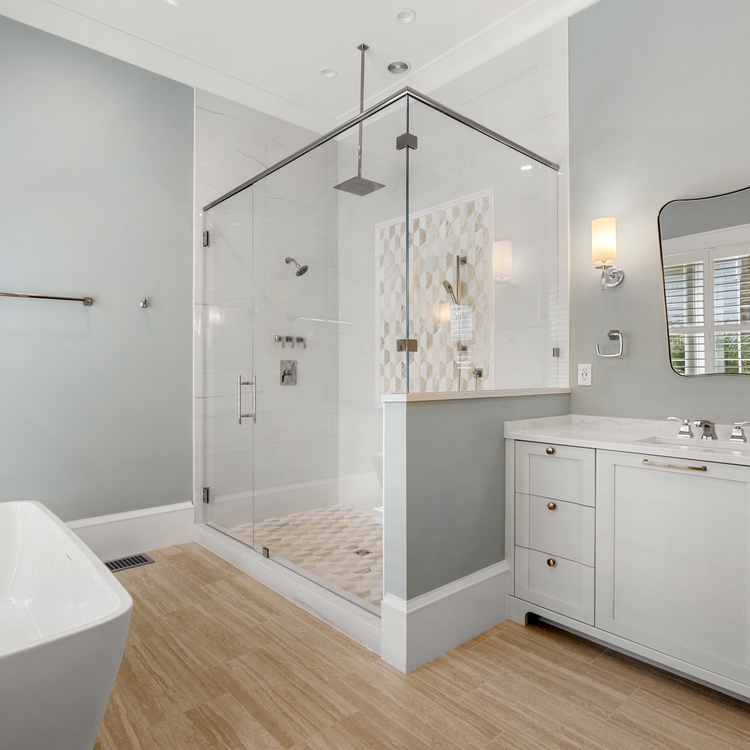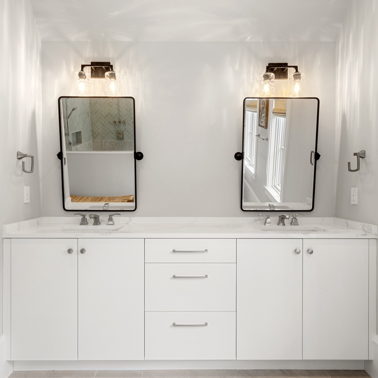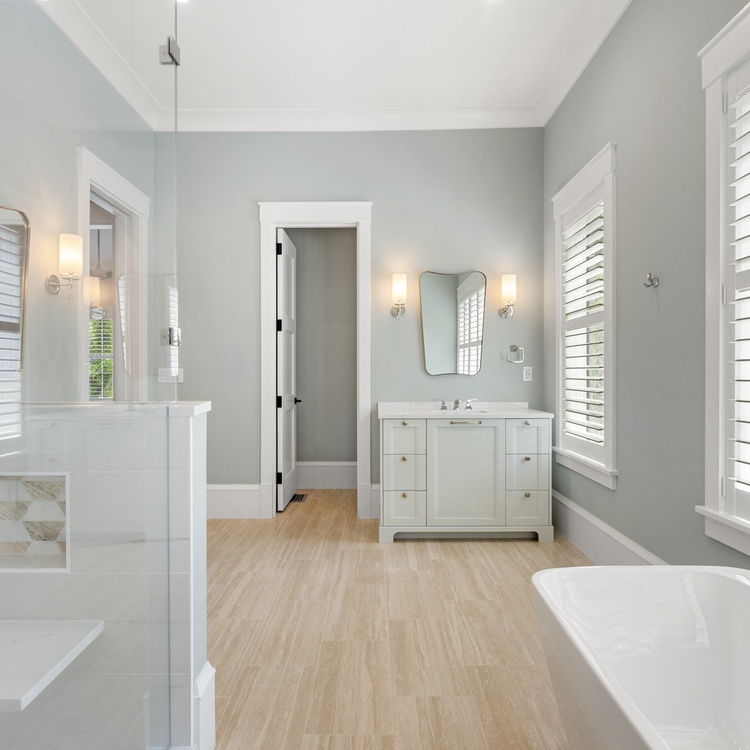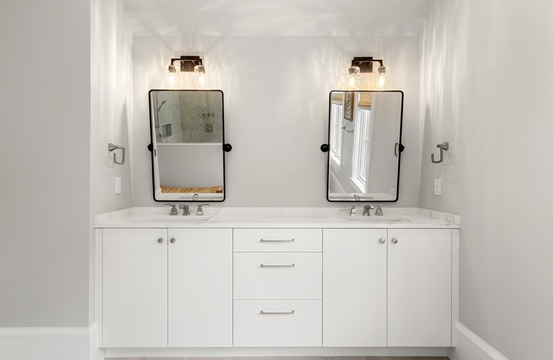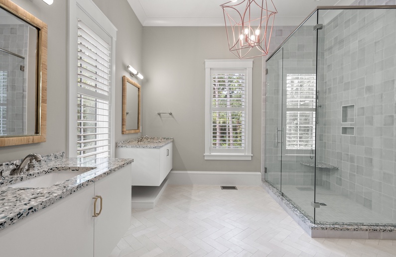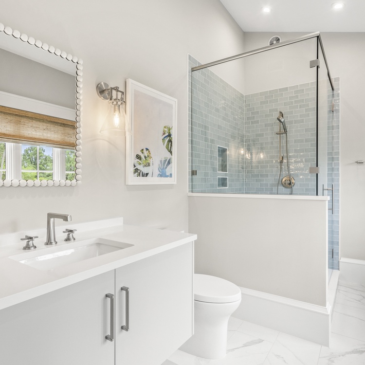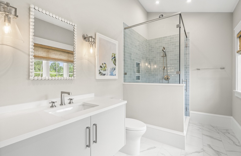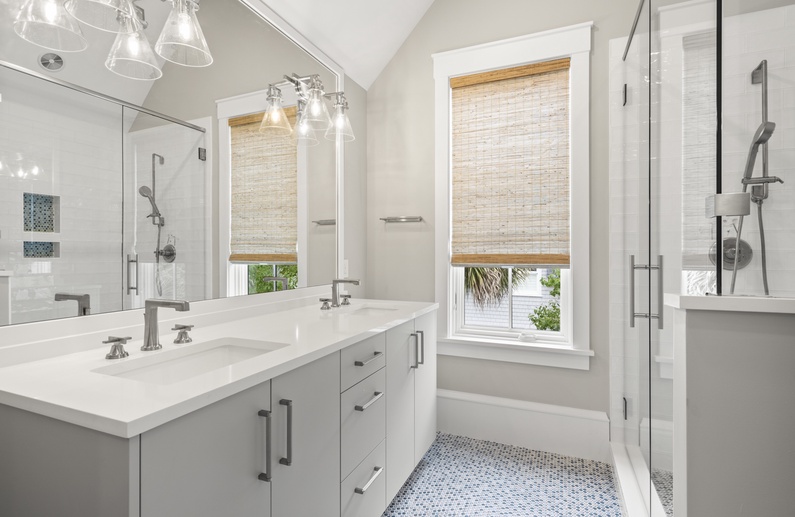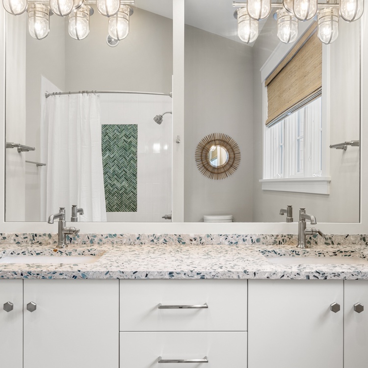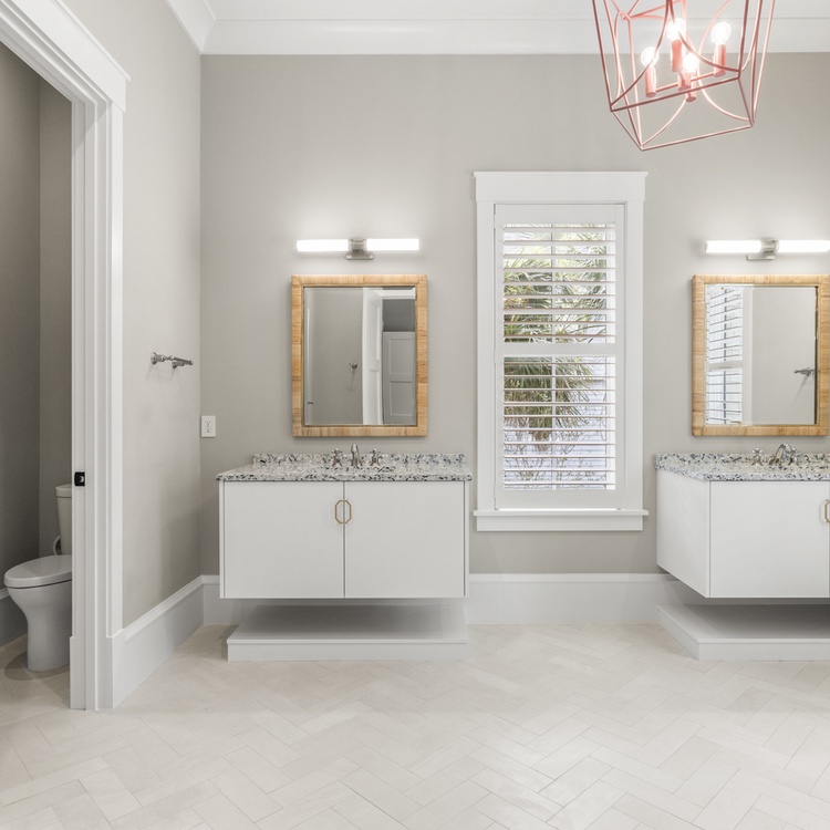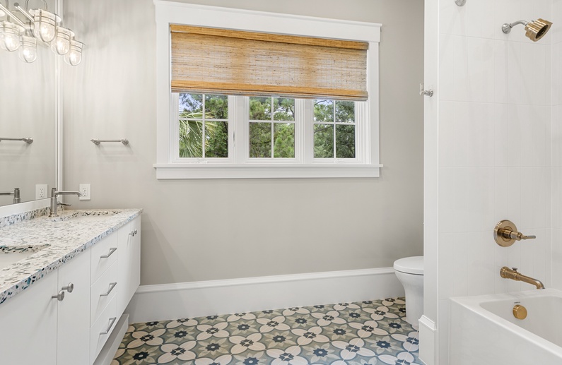 The secondary bedroom is also found on the first floor and features two twin-sized beds and access to a private, secondary bathroom with his and her sinks and a walk-in shower.