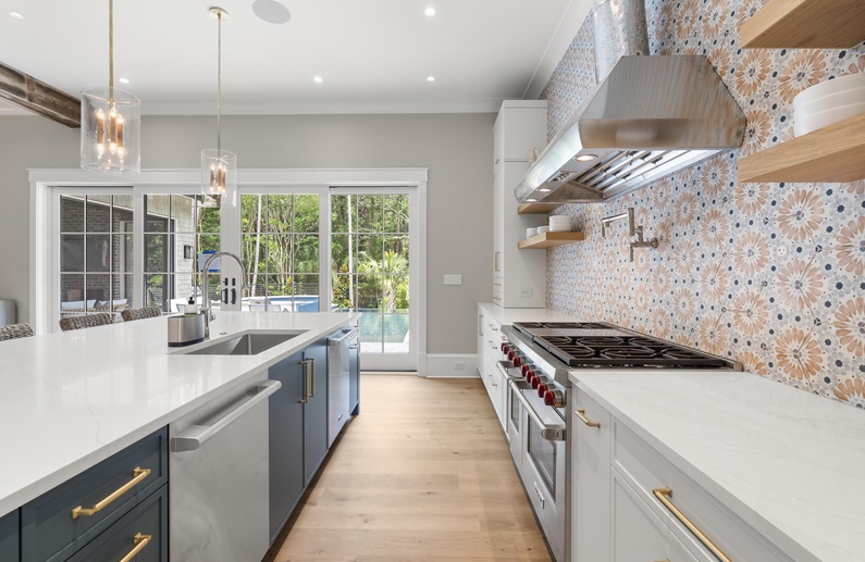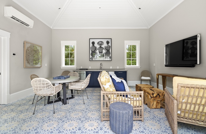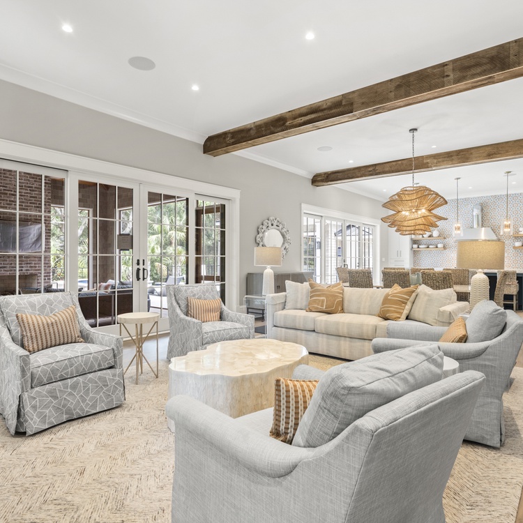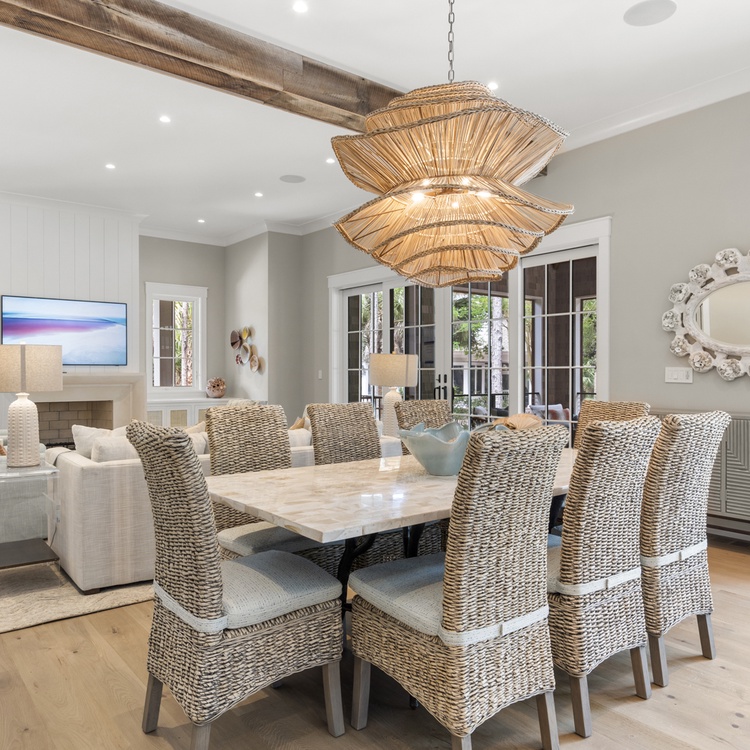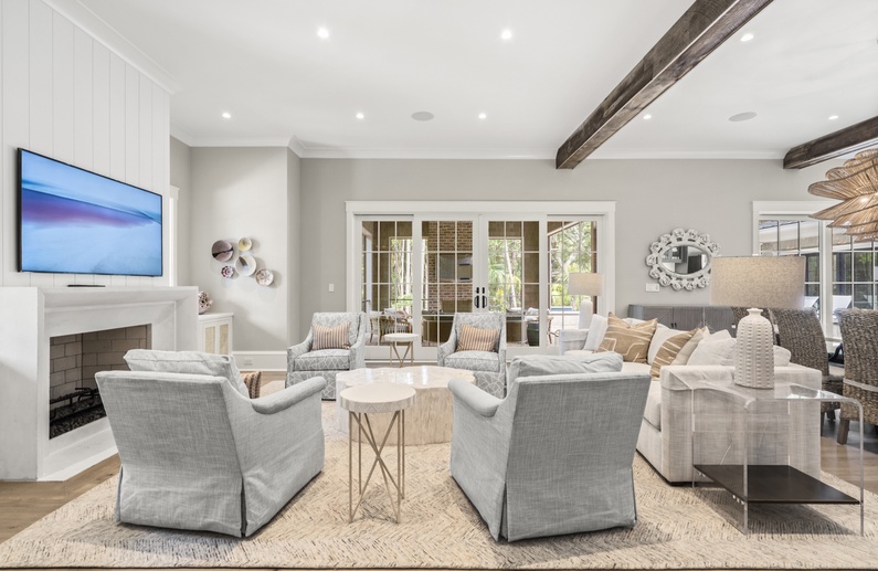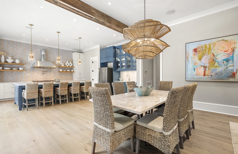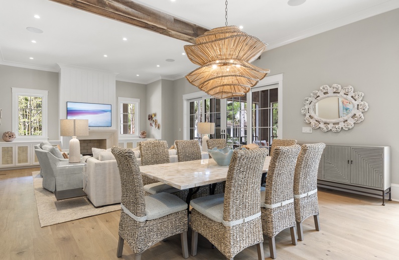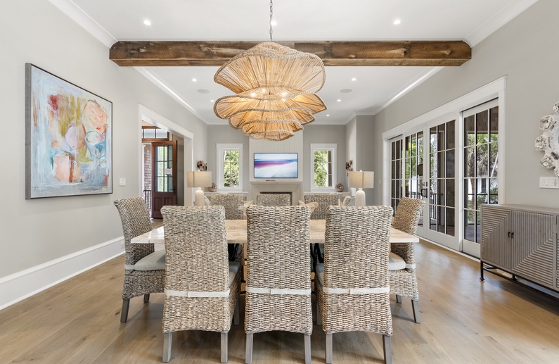 This property is unrivaled! Walk right in and immediately notice all the spectacular details, soft neutral hues, and natural light. In the living area, you will find comfortable seating, a flat-screen TV, and access to the screened porch. The gourmet kitchen area offers upscale cabinetry and all the essentials to prepare your vacation meals. It also features a spacious center island with barstool seating for 5 and views of the pool deck. Adjacent to the kitchen area is the beautiful dining area that sits 8.