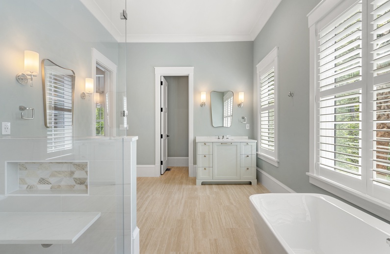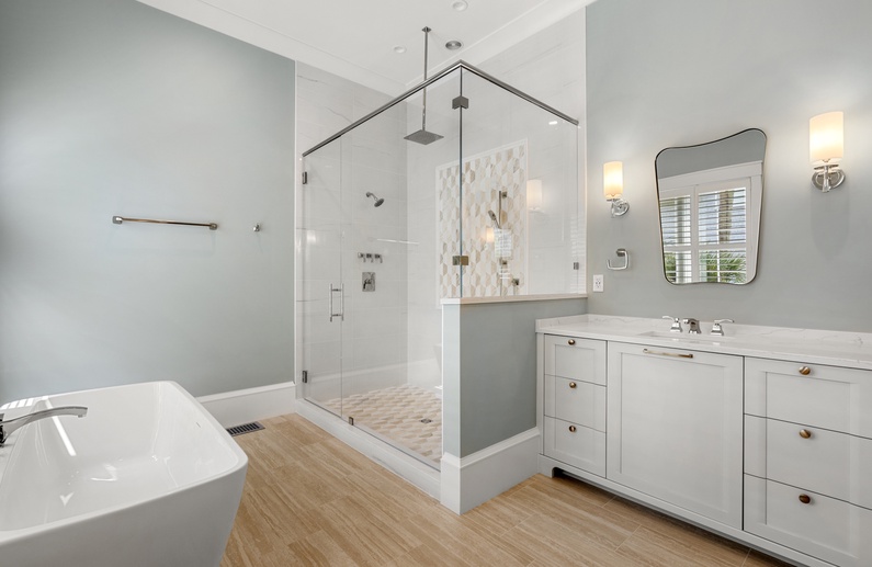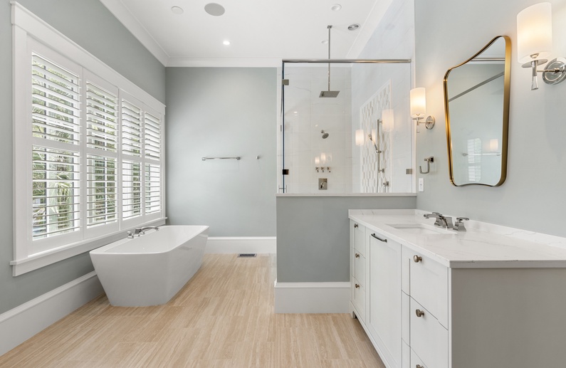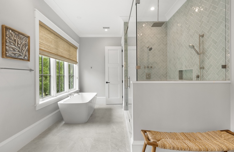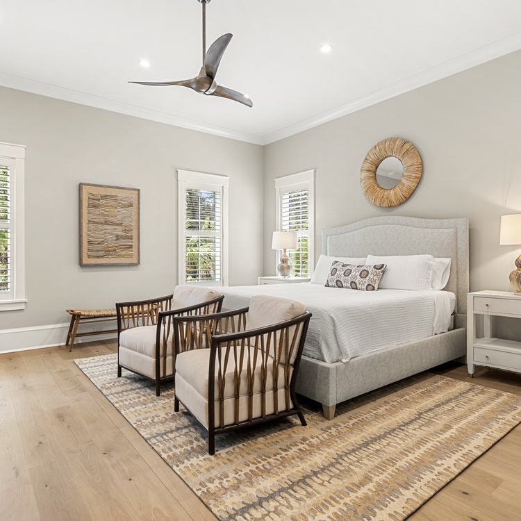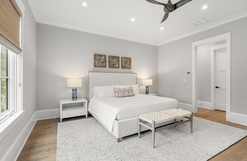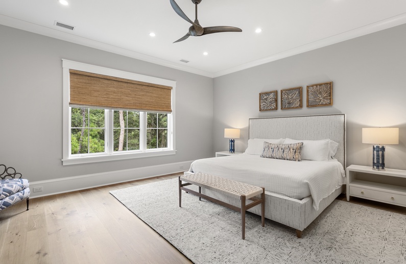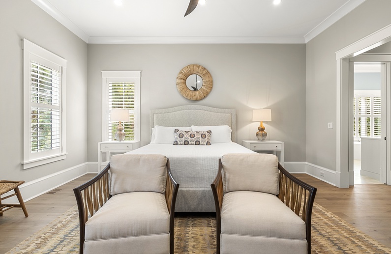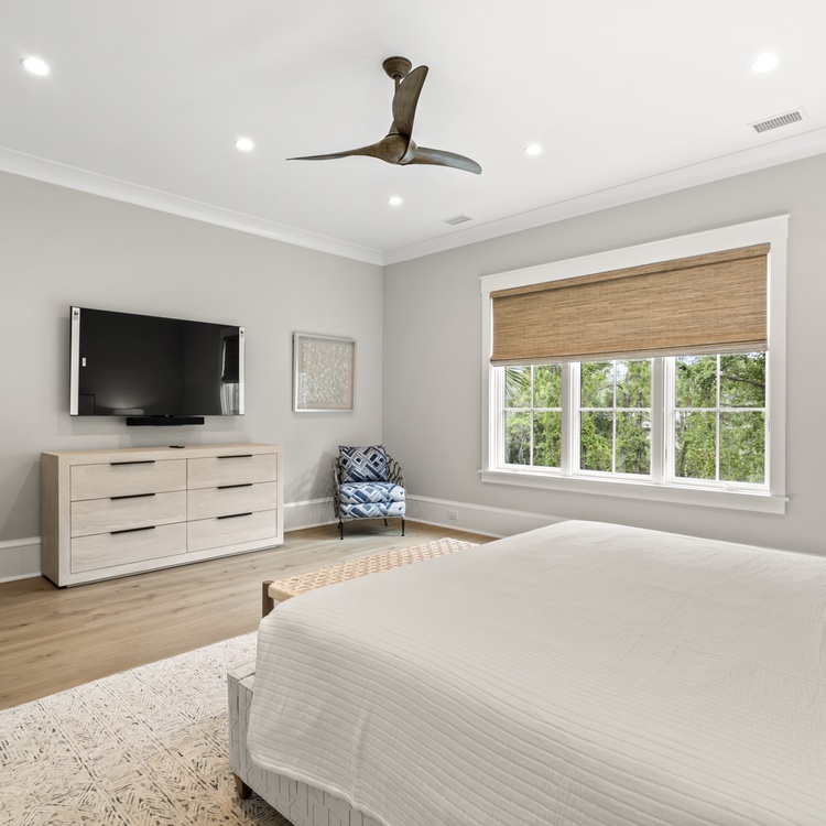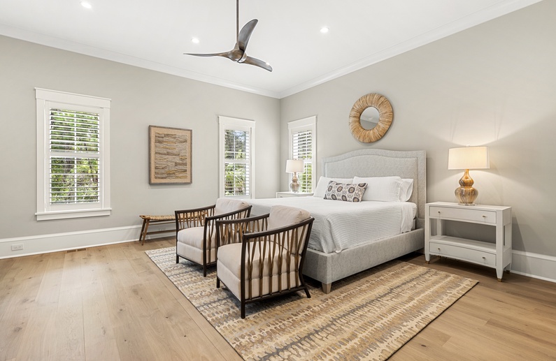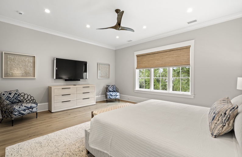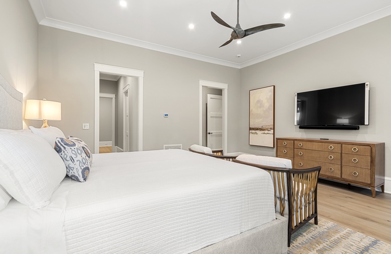 The large, first-floor primary suite features a king-sized bed, seating for 2, a wall-mounted TV, and access to a private bathroom with his and her sinks, a walk-in shower, and a soaking tub.