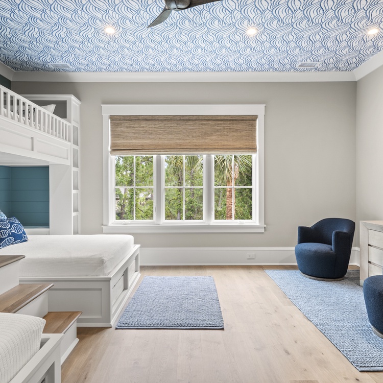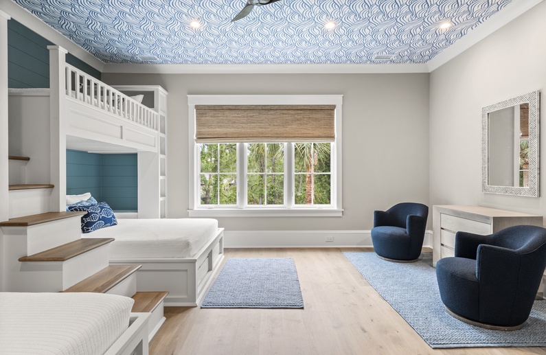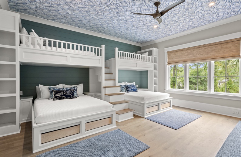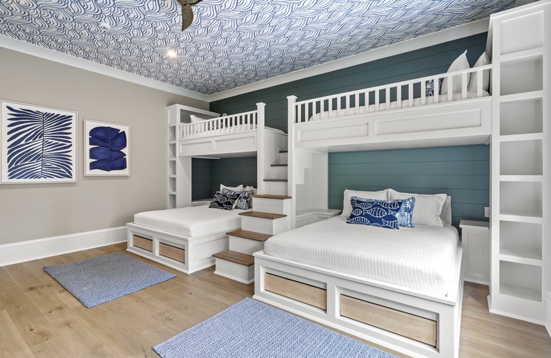 It also offers a kid-friendly, built-in bunk room with 2 twin over queen beds (max occupancy for this room is 4). This room is equipped with a sixth bathroom (also accessible from the hall) featuring a double sink vanity and shower and bathtub combination.