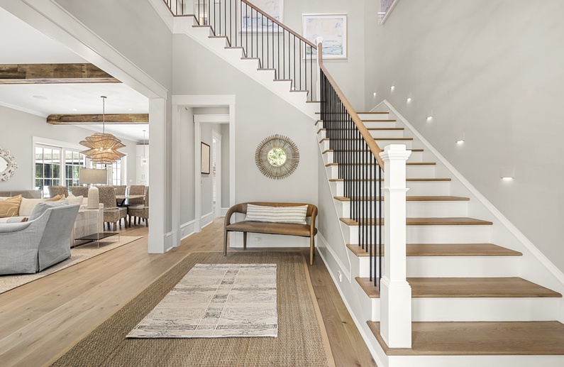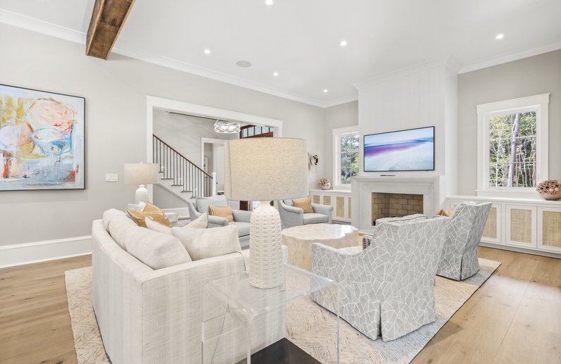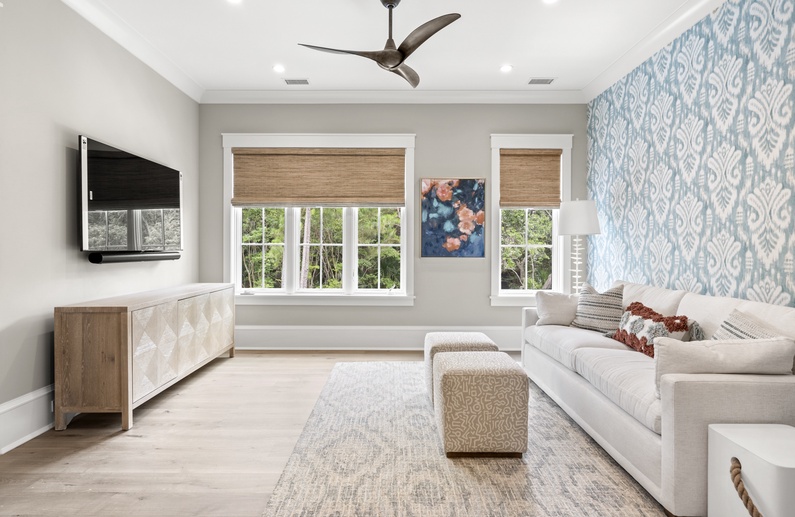 Walk up to the second floor and be greeted by a media room that includes comfortable seating and a wall-mounted TV.