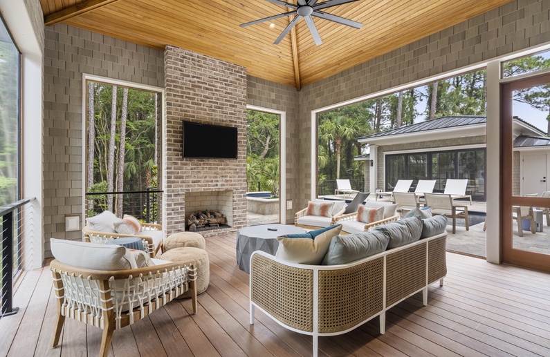 Outside, the spacious screened porch with a TV is perfect for relaxing or enjoying family game nights.