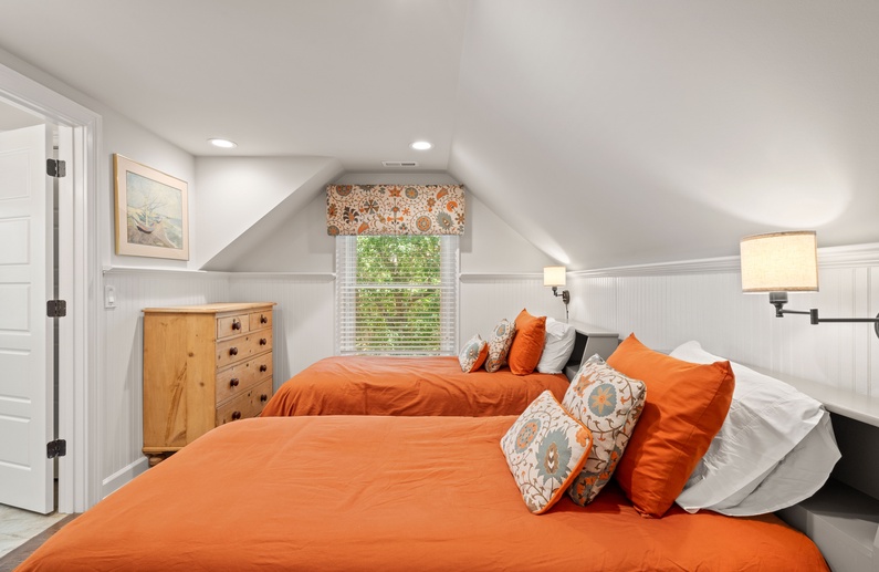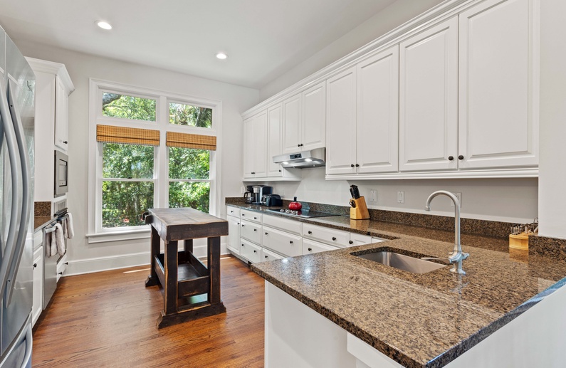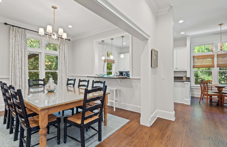 The lovely dining room offers a large table with seating for 8 and 3 stools at the kitchen bar. The fully equipped, gourmet kitchen showcases custom cabinetry, granite countertops, rustic center island, and breakfast area with a table and seating for 4. The light-filled living room features a sofa and cozy chairs, relaxing window seat overlooking the deck and pool, and a large wall-mounted TV.