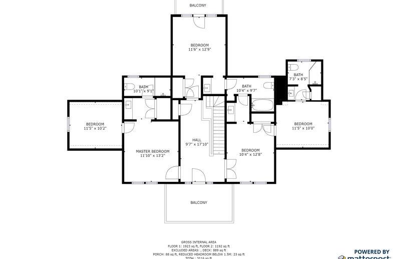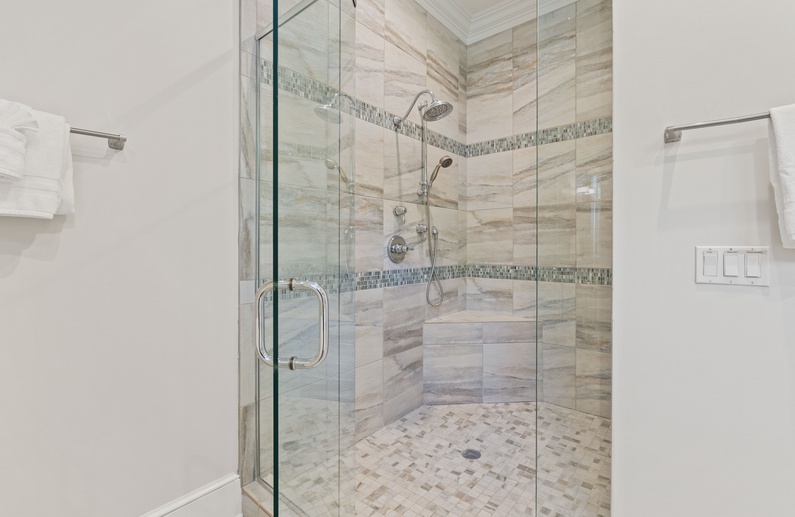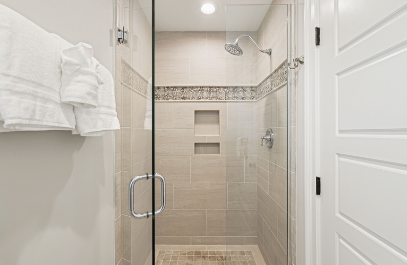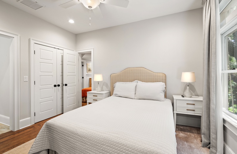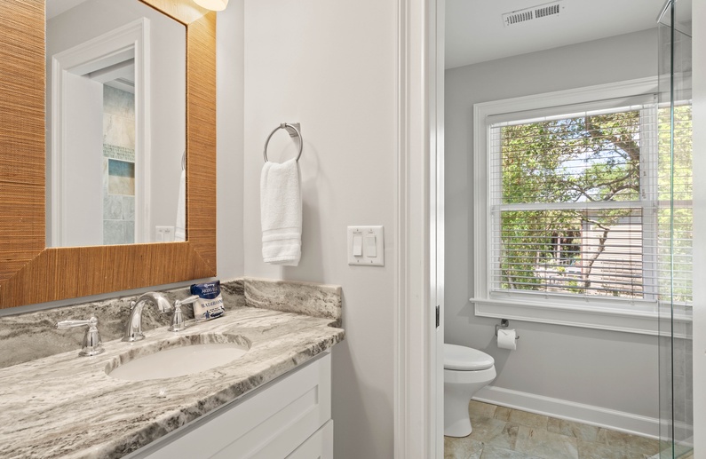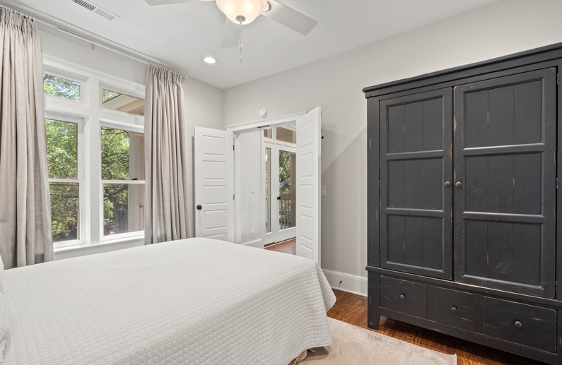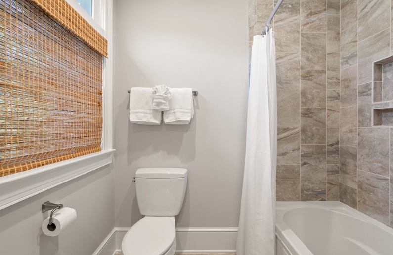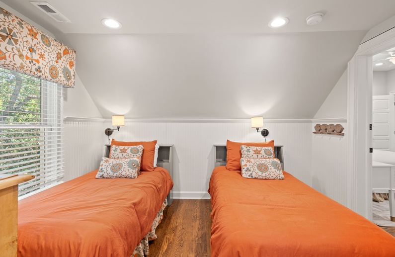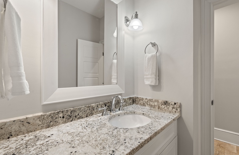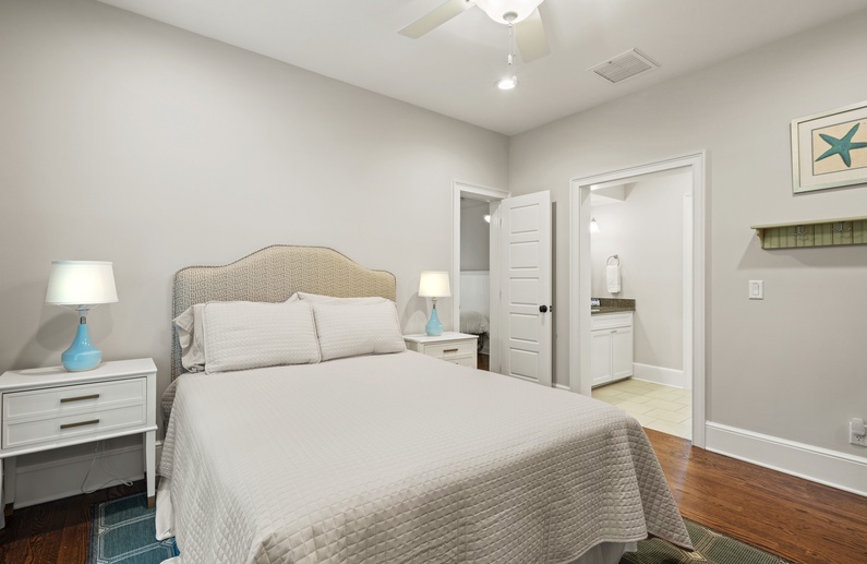 The spacious first-floor primary suite boasts a king bed, sitting area, TV, and a large bathroom with double sinks, shower, and soaking tub. Upstairs, you will find 5 additional bedrooms. To the right is the first parent-child suite: the first room features a queen bed and a TV; the second room has two twin beds; the bedrooms share a bathroom with shower. Towards the back of the home is a queen bedroom with a TV, a balcony overlooking the deck and pool, and a private sink vanity for the shared Jack-and-Jill bathroom with tub/shower combo. To the left is the second parent-child suite: the first room features a queen bed, a TV, and a private sink vanity for the shared Jack-and-Jill bathroom with tub/shower combo; the second room has 2 twin beds and its own bathroom with shower.