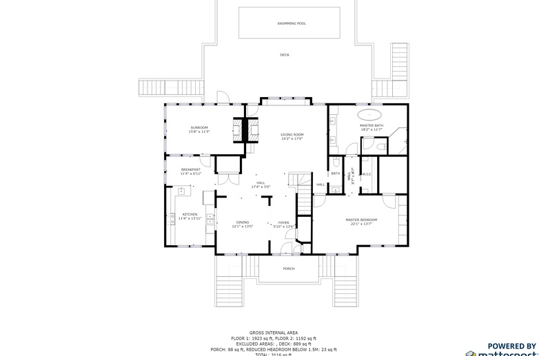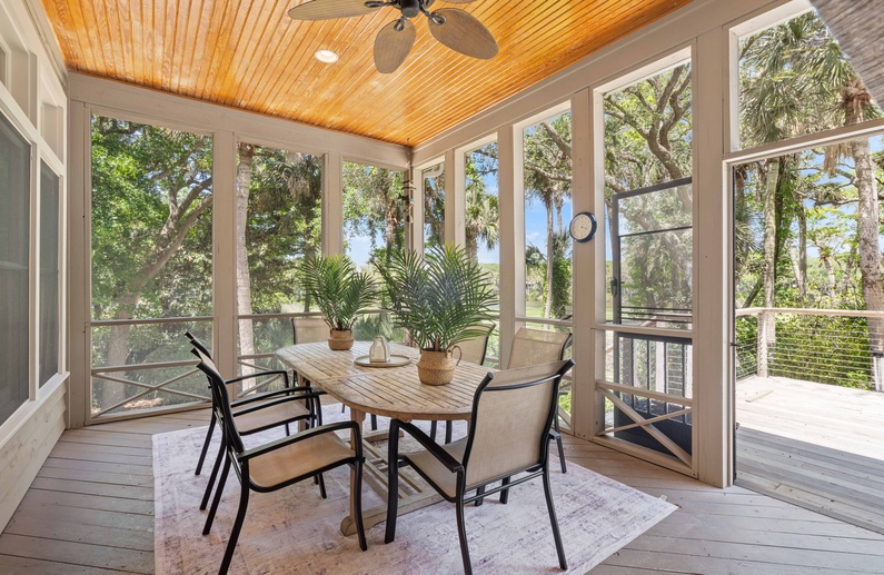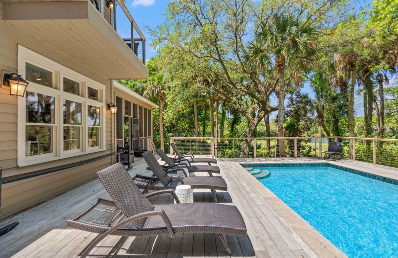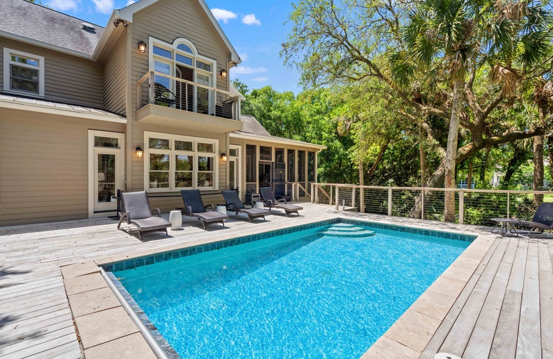 The screened porch offers a dining table and 6 chairs as well as access to the back deck. The home’s large yet private deck and swimming pool are surrounded by trees and sunshine. The pool is approximately 24ft x 13ft. The deck features a gas grill as well as multiple lounge and Adirondack chairs. Both the screened porch and deck offer golf course and lagoon views.