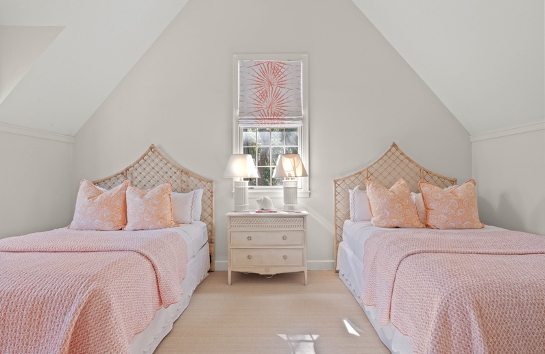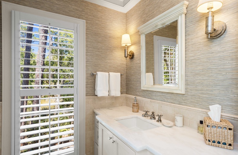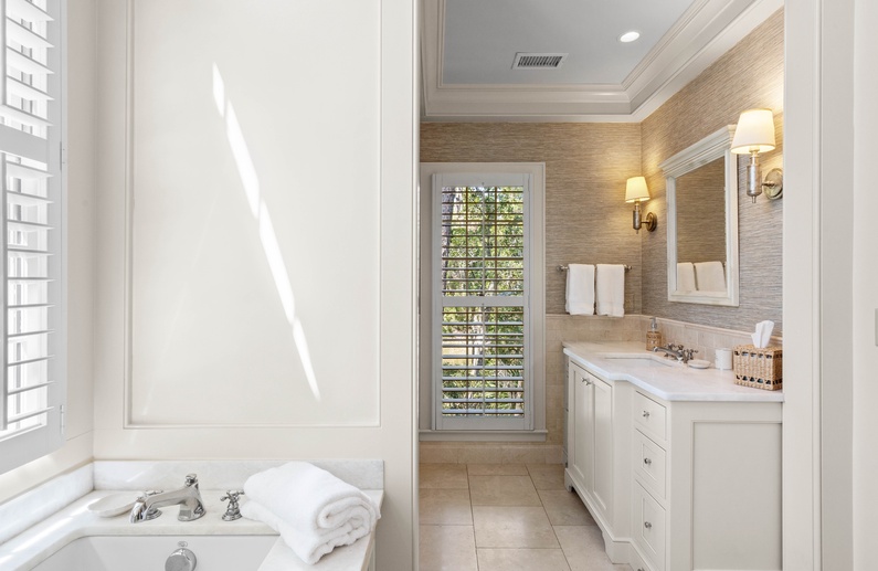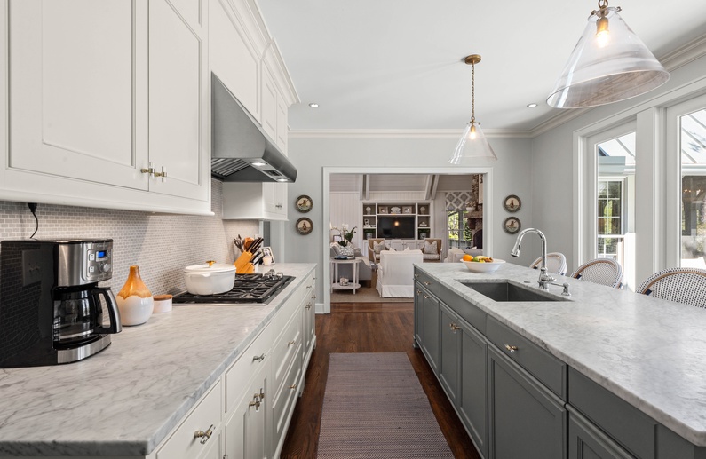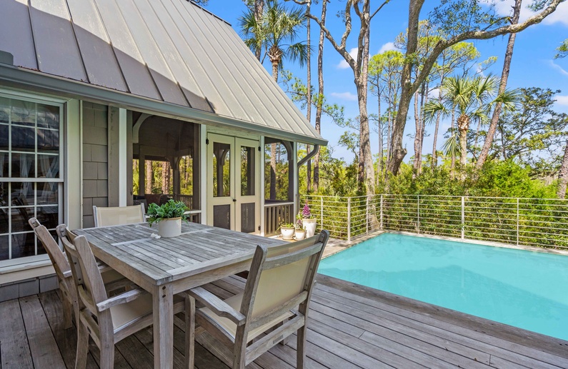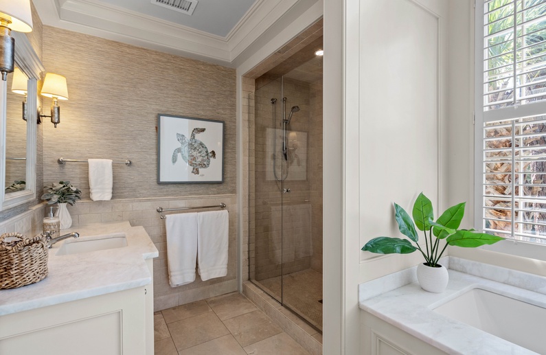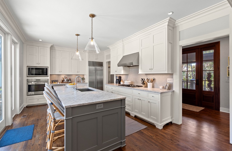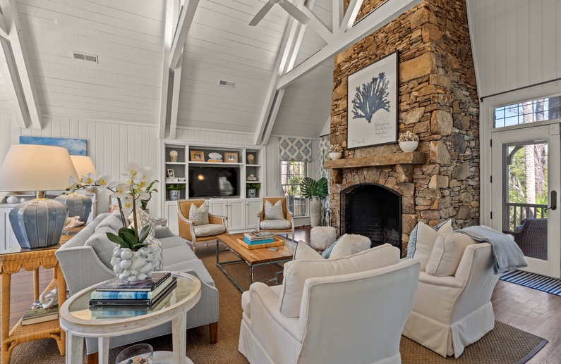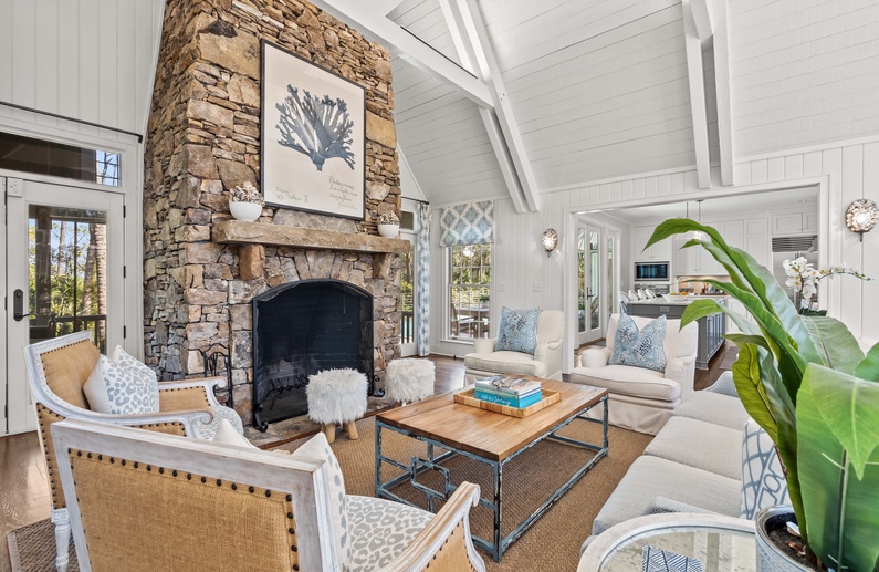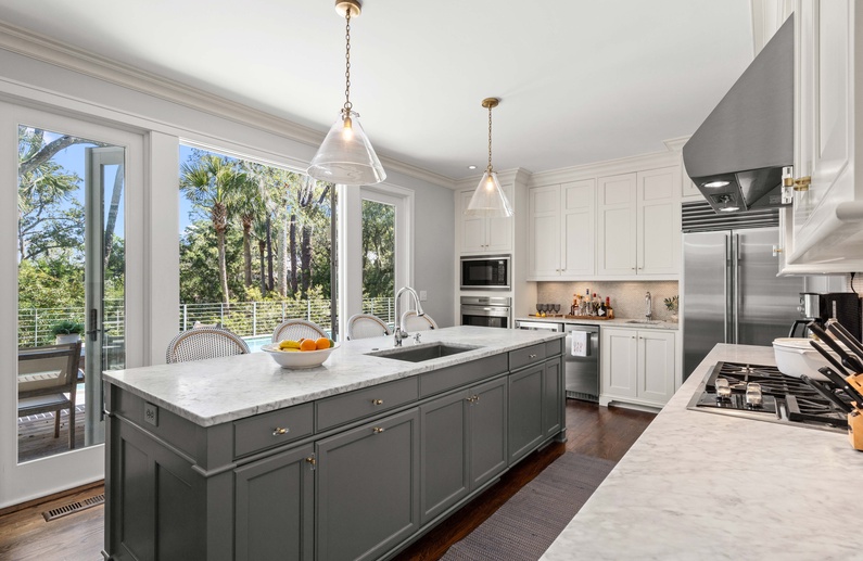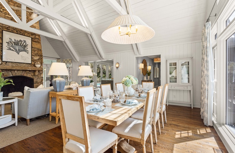 The living room features a comfortable sofa and four cozy chairs, large flat-screen TV, and access to the screened porch. The light-filled dining area offers a long table with seating for ten. The stunning gourmet kitchen showcases marble countertops, large island with bar seating for four, Subzero refrigerator, Wolf oven, microwave, and gas range, a wine refrigerator, and access to the pool deck.