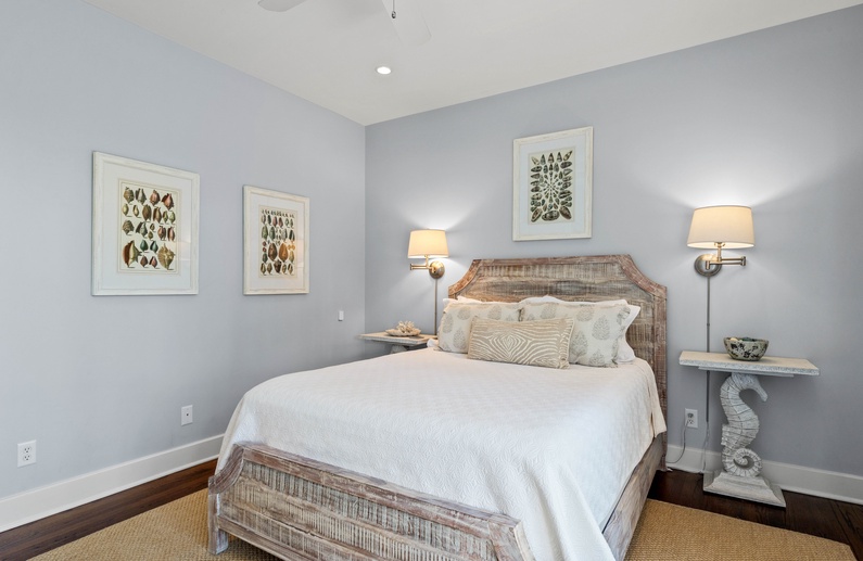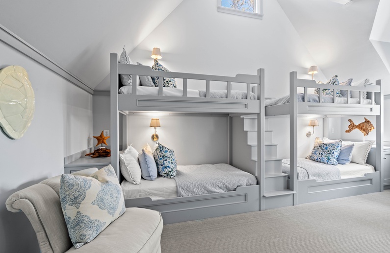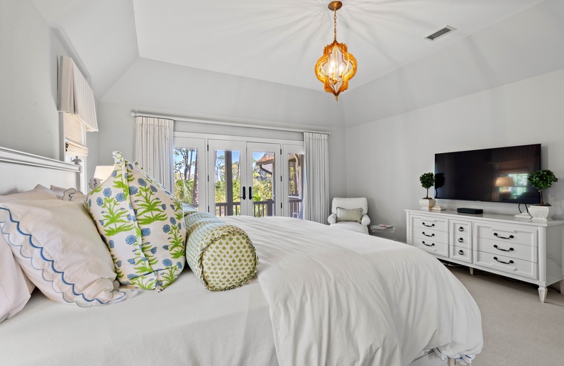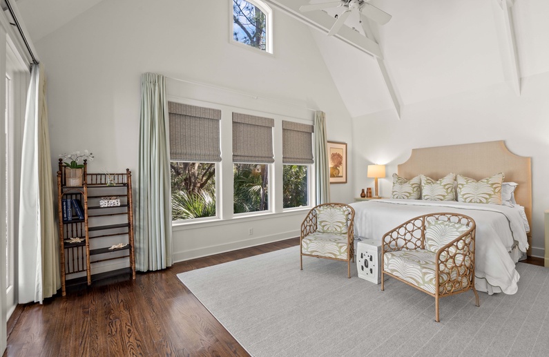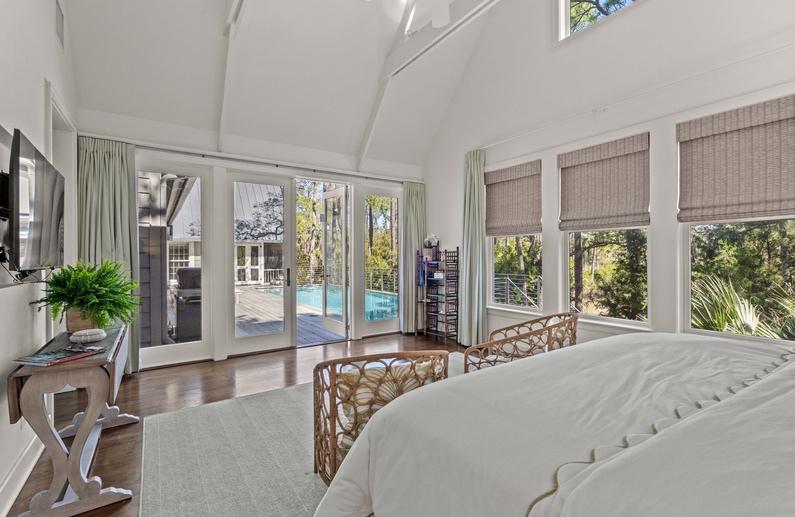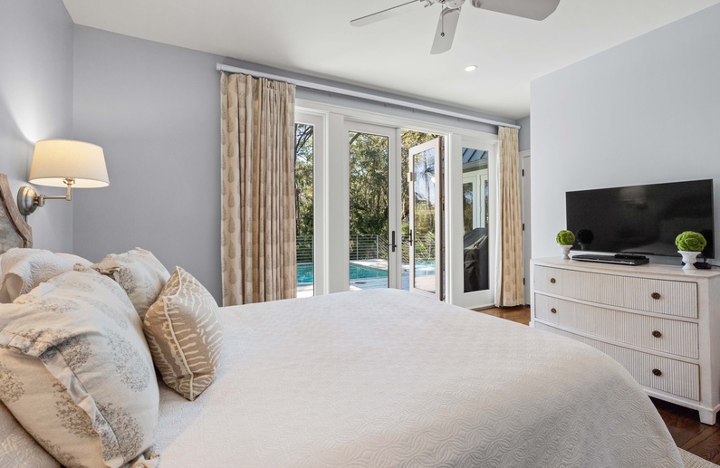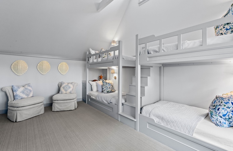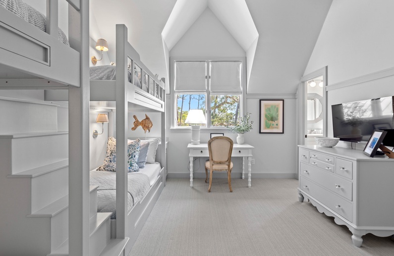 The first floor offers 3 bedrooms, including two suites. The first primary suite features a king bed, chaise lounge, flat-screen TV, private deck overlooking the marsh, and bathroom with two vanities, soaking tub, and shower. The secondary suite offers a king bed, two cozy chairs, wall-mounted flat-screen TV, access to the pool deck, and bathroom with shower. A queen bedroom features a flat-screen TV, access to the pool deck, and bathroom with shower/tub combination. The second floor offers two additional bedrooms. One bedroom offers 2 queen beds, flat-screen TV, and bathroom with shower/tub combination. The other bedroom features two sets of bunk beds (offering 4 twin beds), two cozy chairs for reading or watching the wall-mounted flat-screen TV, and a bathroom with shower/tub combination.