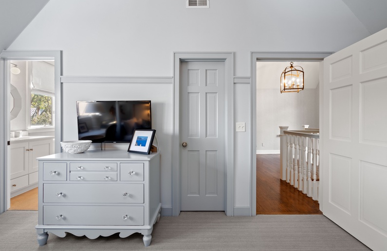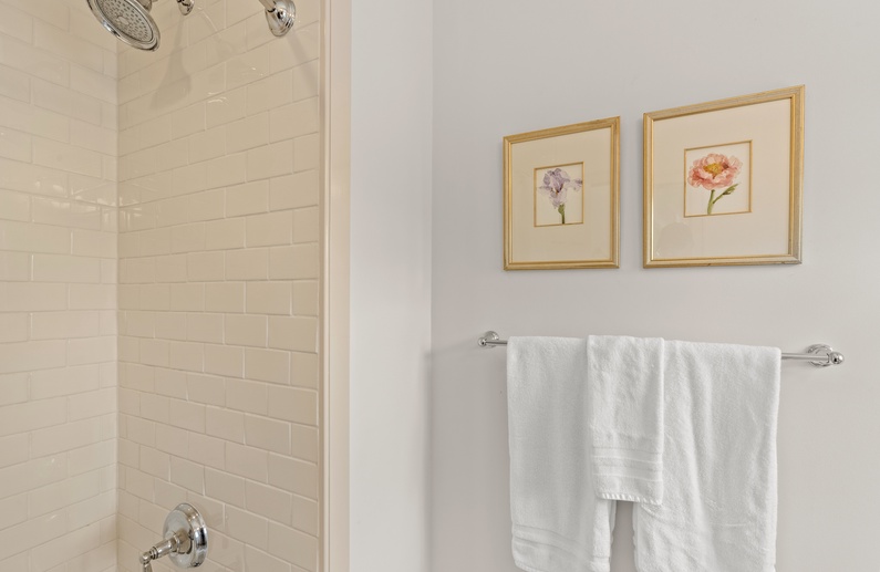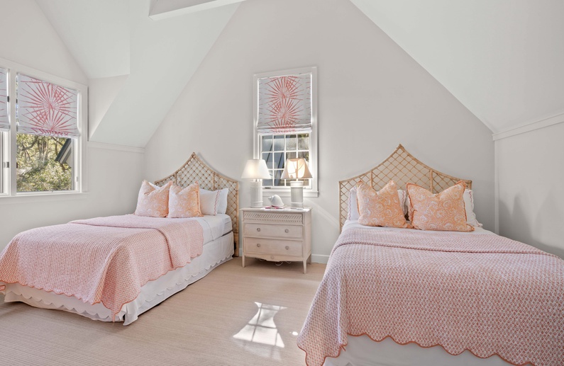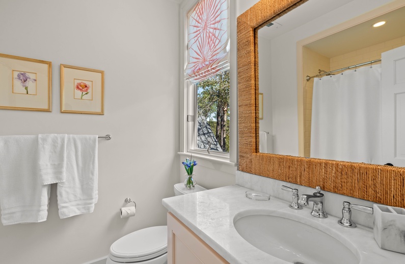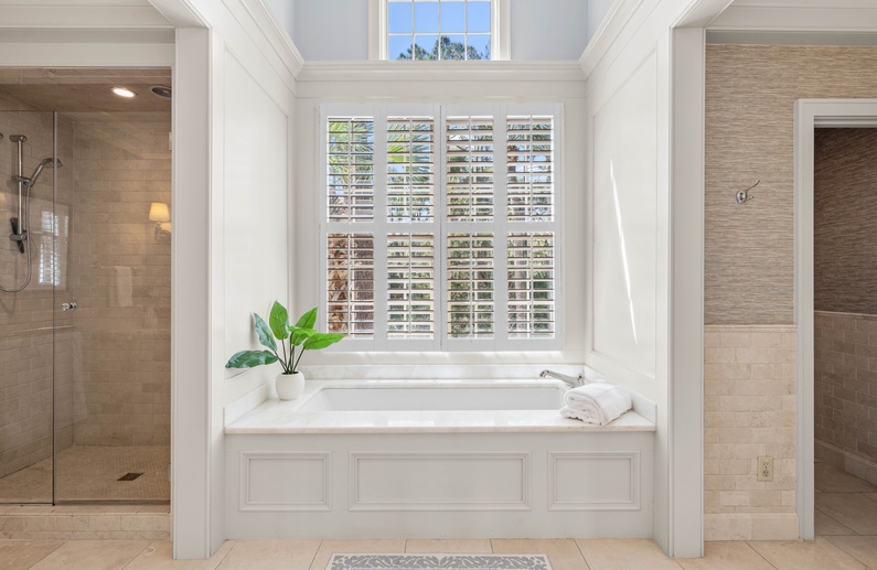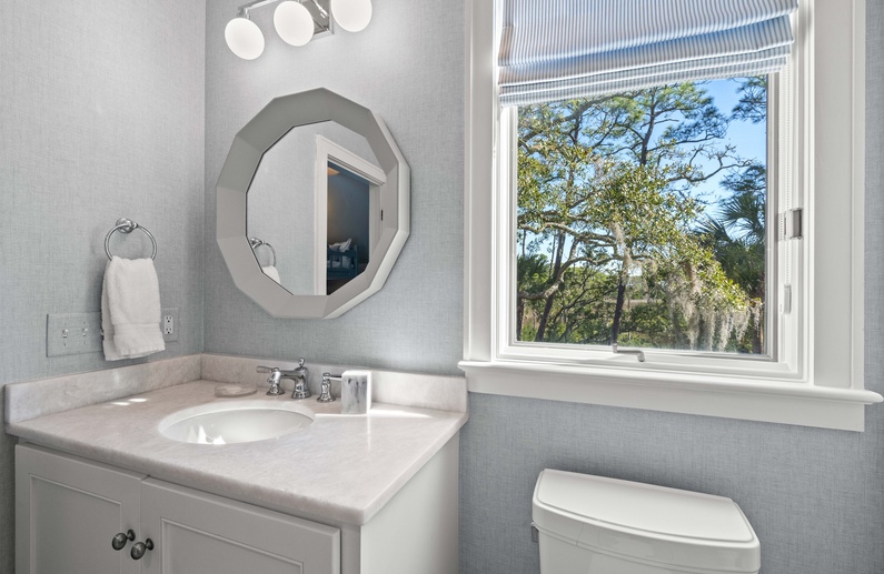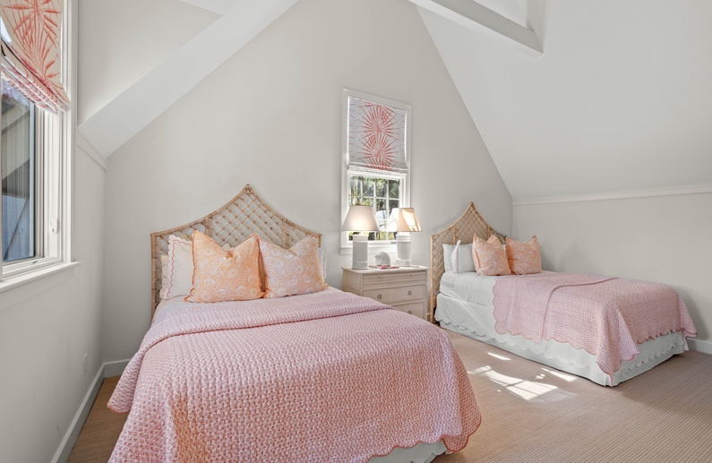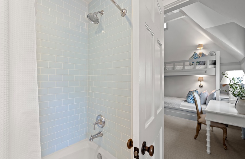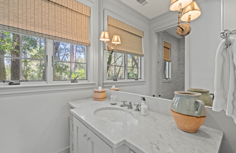 The first floor offers 3 bedrooms, including two suites. The first primary suite features a king bed, chaise lounge, flat-screen TV, private deck overlooking the marsh, and bathroom with two vanities, soaking tub, and shower. The secondary suite offers a king bed, two cozy chairs, wall-mounted flat-screen TV, access to the pool deck, and bathroom with shower. A queen bedroom features a flat-screen TV, access to the pool deck, and bathroom with shower/tub combination. The second floor offers two additional bedrooms. One bedroom offers 2 queen beds, flat-screen TV, and bathroom with shower/tub combination. The other bedroom features two sets of bunk beds (offering 4 twin beds), two cozy chairs for reading or watching the wall-mounted flat-screen TV, and a bathroom with shower/tub combination.