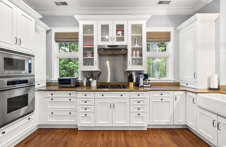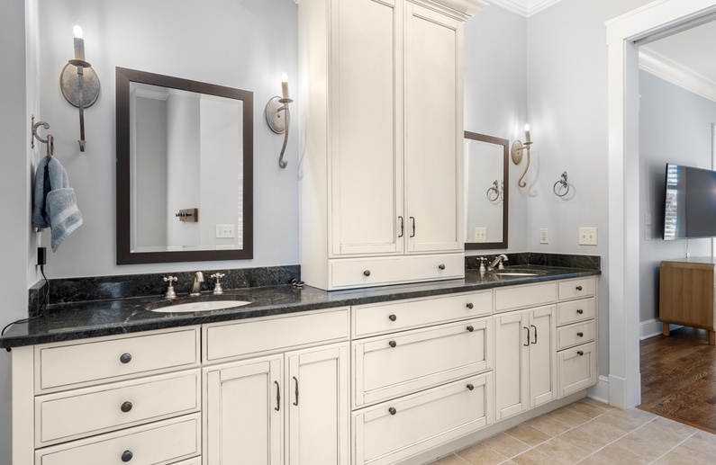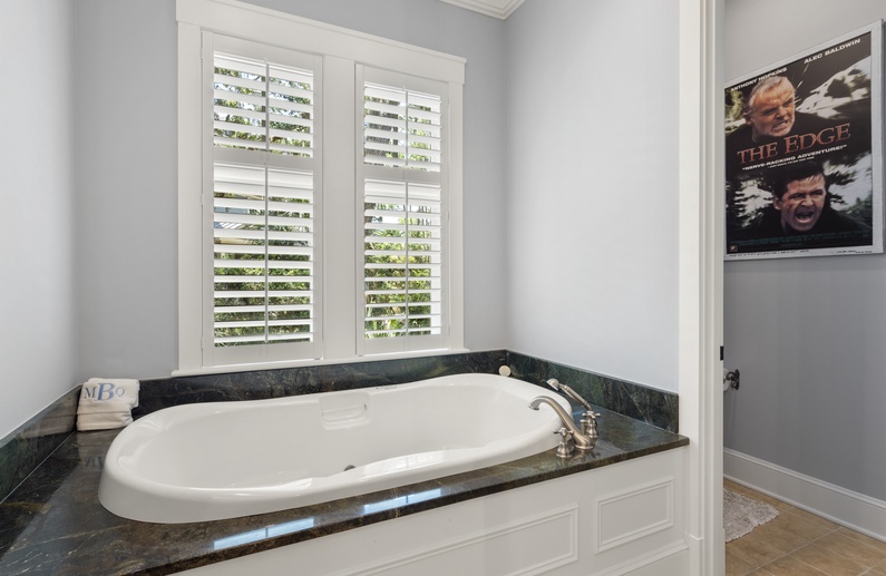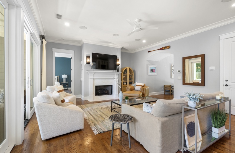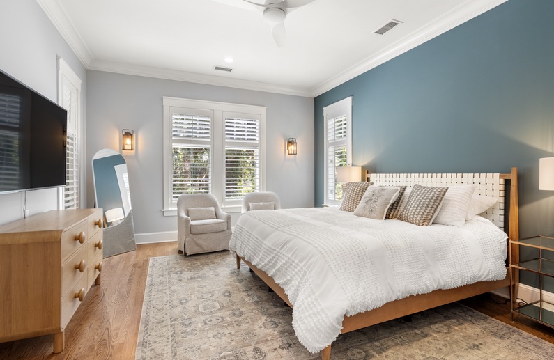 Upon entering the property, you’ll find exquisite finishes, accentuated hardwood flooring, soft neutral hues, and abundant natural light. In the main living area, you will find upscale and comfortable seating, a large flat-screen TV, and sliding door access to the screened porch. The fully equipped kitchen offers white cabinetry, stainless steel appliances, ample counter space, and an island with barstool seating. The dining area serves as the perfect entertainment space as it offers scenic views, ample seating for your whole party, and close proximity to the kitchen.