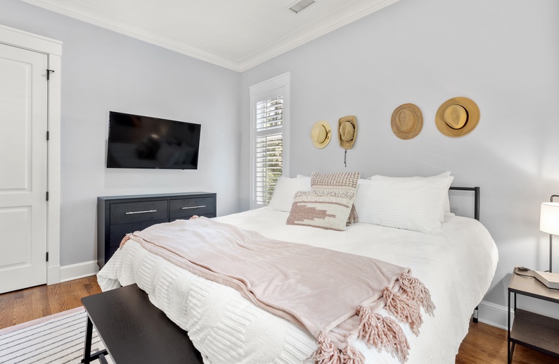 The first-floor secondary bedroom features a king-sized bed, a wall-mounted flat screen TV, and a private bathroom with a glass walk-in shower.