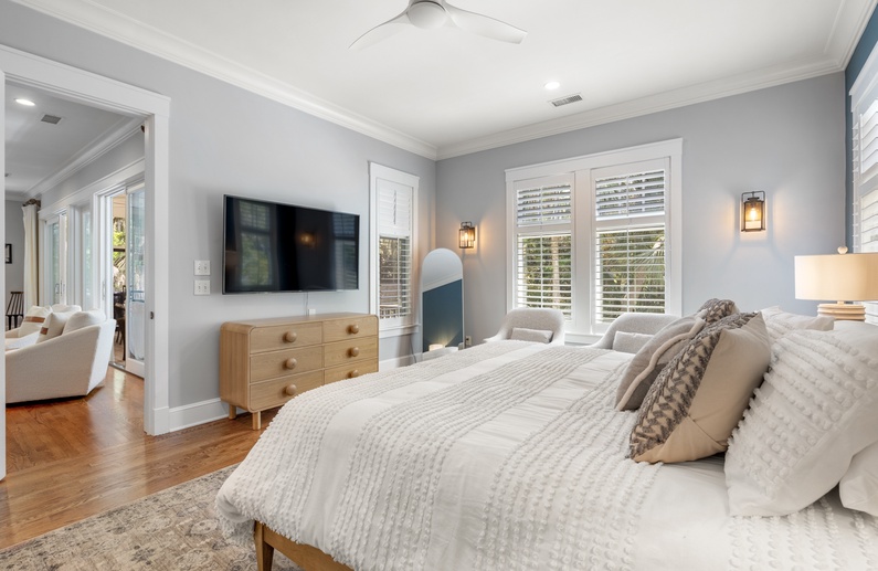 The first-floor primary bedroom features a wall-mounted flat-screen TV, a king-sized bed with notable bedding, and 2 comfortable sofa chairs. It also features a private bathroom with a double sink vanity, a glass walk-in shower, and a spacious bathtub.