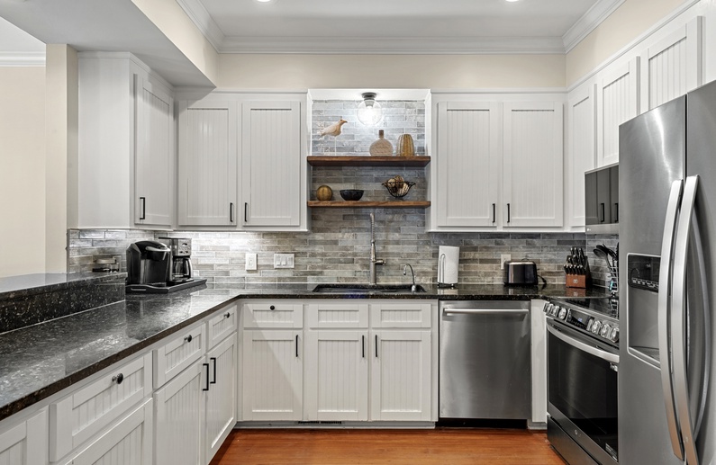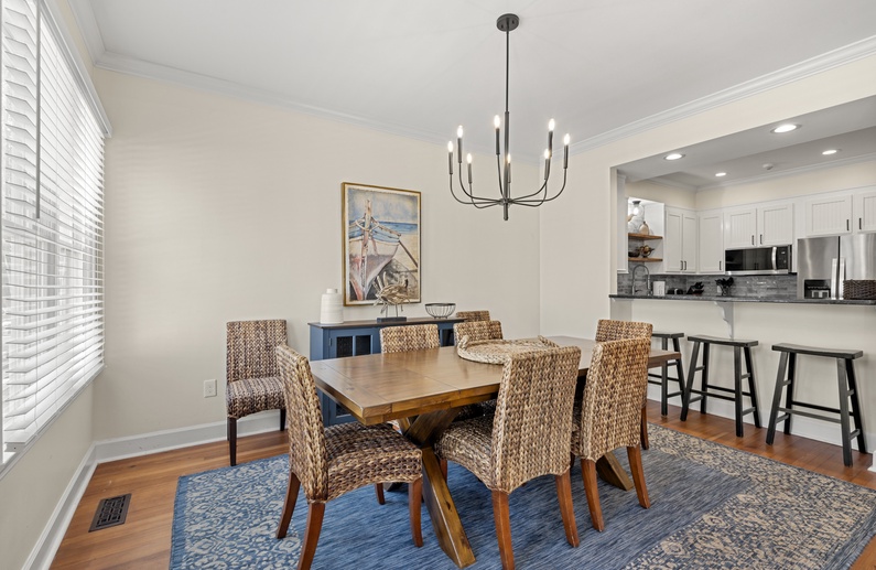 When you enter the home, the dining room, kitchen, main living space, and master suite are on the entry-level floor. The relaxing living room features comfortable sofas, chairs, an electric fireplace with a heater, and a 65” flat-screen TV. The living room also has games and speakers for additional entertainment, and it opens to a deck off the side of the home. The dining room offers a large table with plenty of seating. The fully equipped kitchen showcases cabinetry, beautiful countertops, new stainless steel appliances, and a bar that connects the kitchen to the dining room.