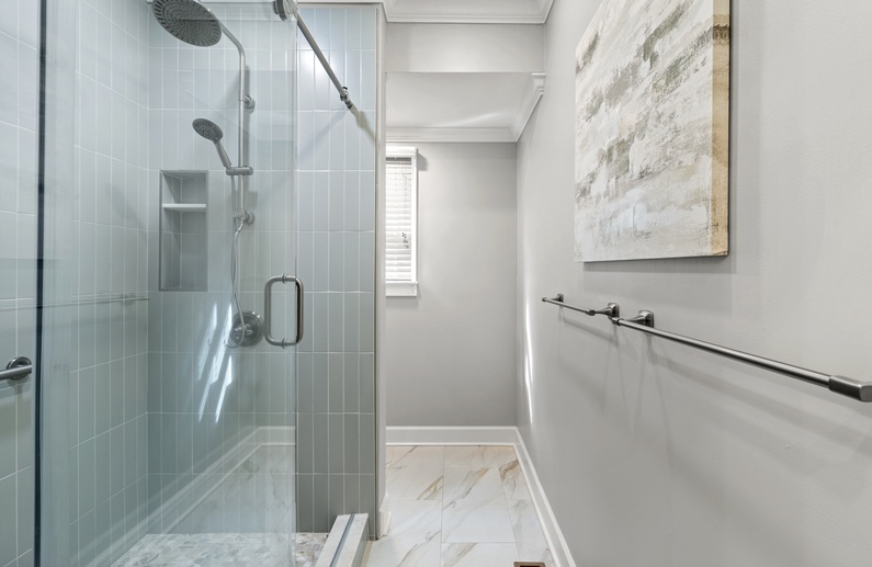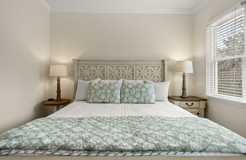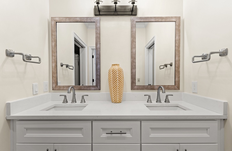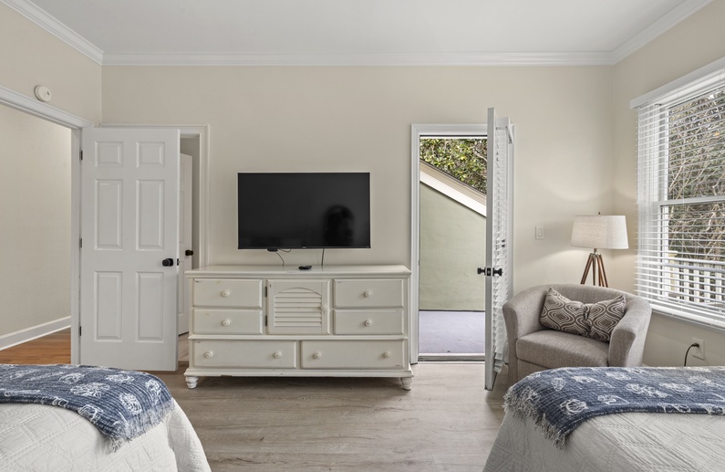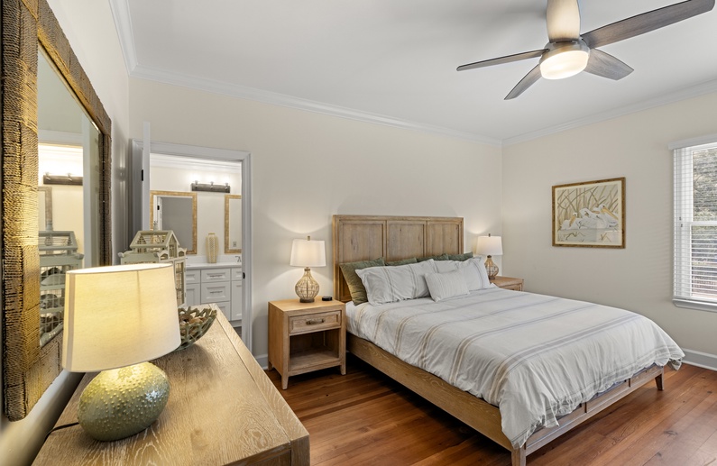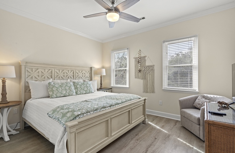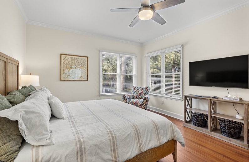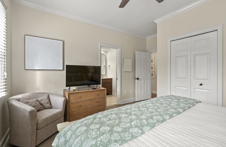 Down the hall from the living room is the soothing primary suite, boasting a king-sized bed, a sitting area, and a flat-screen TV. The primary suite has a large private bathroom with double sinks and a spacious shower.