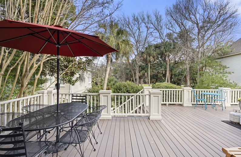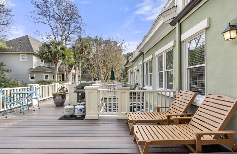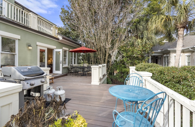 The shared back deck features an array of chairs for stretching out and lounging or congregating around the gas grill for a nice meal. The large table has seating for six and an umbrella for shade. The deck overlooks the golf course just past the backyard of the home.