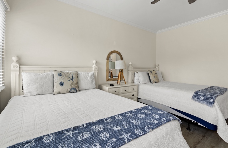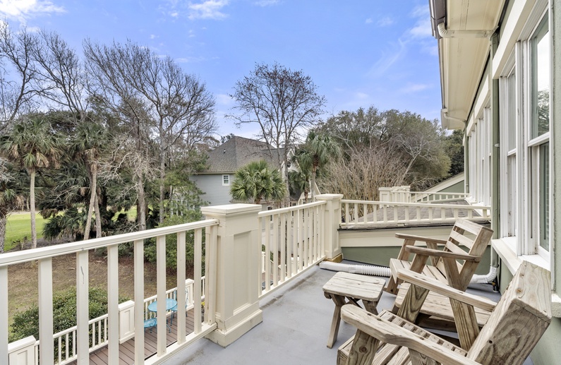 Ascend the stairs to the second floor and you are greeted by a hallway that provides access to a screened porch on the front of the house. There are two bedrooms and two bathrooms on the second floor. The first bedroom features two queen-sized beds, a TV, private balcony, and a connected bathroom with two sinks, a walk-in shower, and tub. The second bedroom has one king bed, a TV, and a bathroom with a walk-in shower.