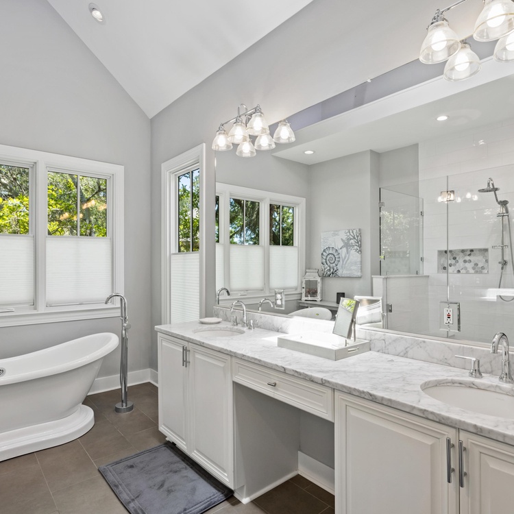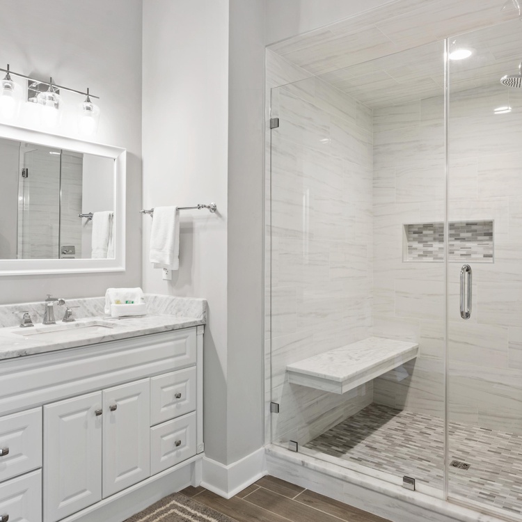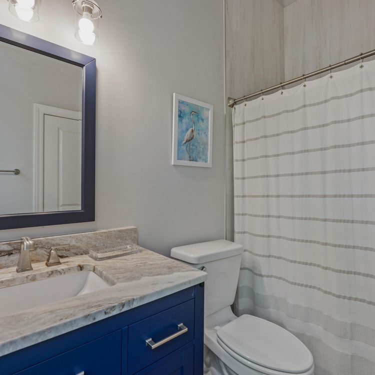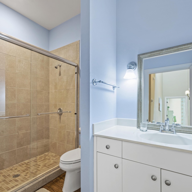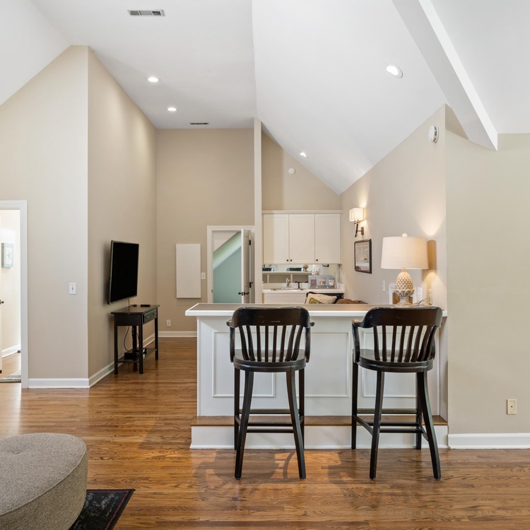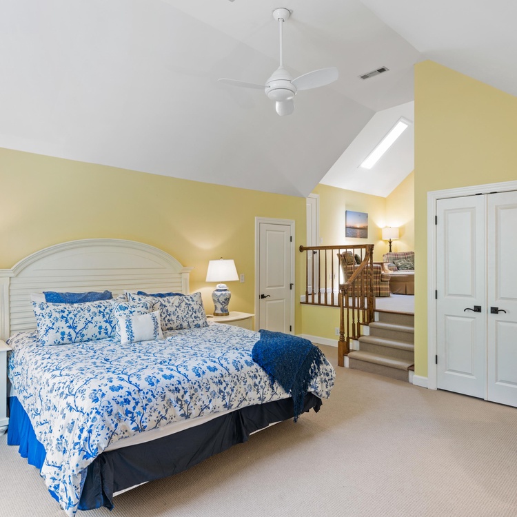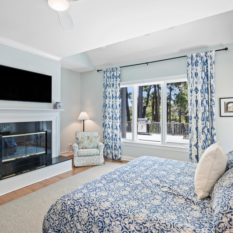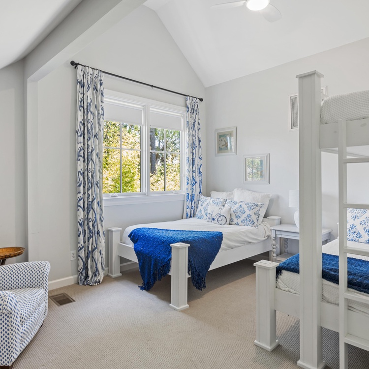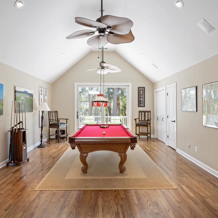 On the main floor, you will find four of the home's six bedrooms. The first, a luxurious primary suite, features a king-sized bed, a TV, and a beautifully renovated private bathroom. Spa-like and serene, the bathroom offers a free-standing tub, a spacious walk-in shower, and a dual-sink vanity. Three additional bedrooms each have their own bathroom. Two bedrooms have a queen-sized bed, and one bedroom has two twin beds. Ascend the stairs to reach the second floor, complete with two bedrooms, a game room, a balcony, and a second living area. Two bedrooms – one king bedroom with a sitting area and one bedroom with a twin over full bunk bed and one full bed – share a bathroom. The game room features a pool table, a sitting area with a TV, and a bar area.
