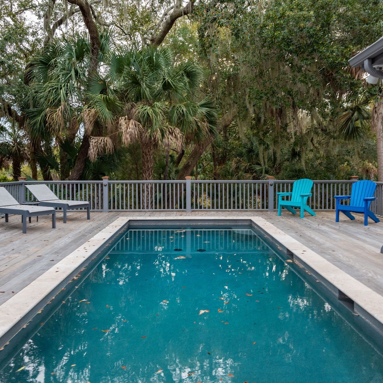 Step outside to enjoy the home's beautiful private pool. The pool deck spans the length of the house and offers plenty of space to lounge. Whether you want to cool off in the pool, bask in the beautiful setting, or enjoy al fresco dining, the back deck perfectly complements the home.