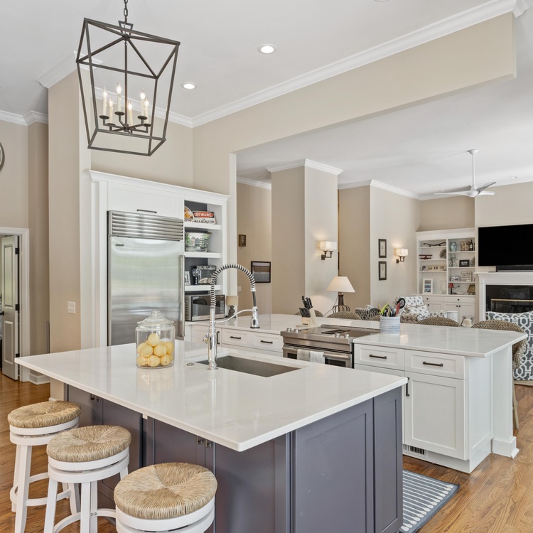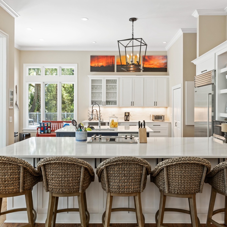 The main floor includes the living room, dining room, sunroom, kitchen, and access to the pool deck. Accentuated by soaring ceilings, the living room offers comfortable seating and an adjacent light-filled sunroom. Guests will love cooking in the recently renovated kitchen with its high-end appliances, two center islands, and ample barstool seating. The dining room is conveniently located off the kitchen for easy meal prep and entertaining.