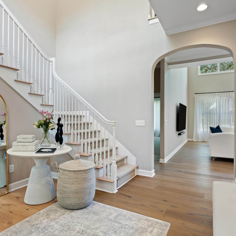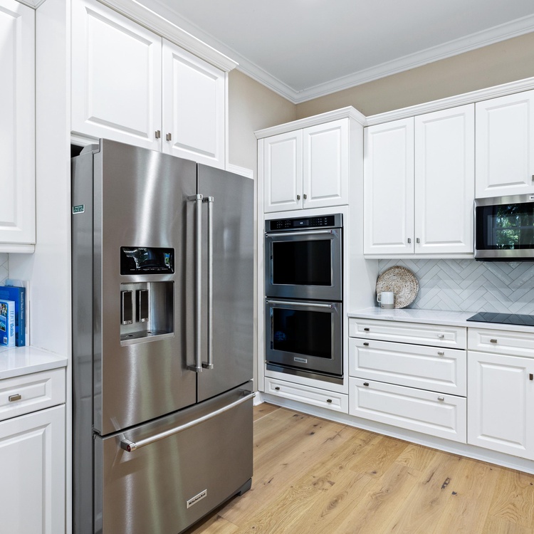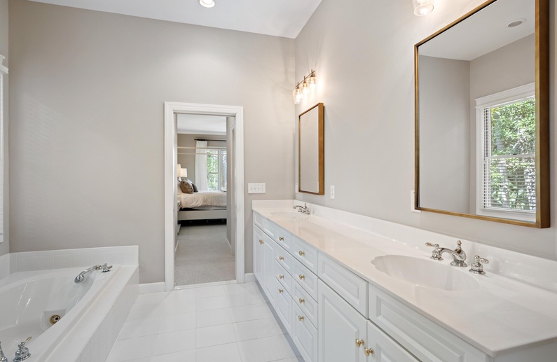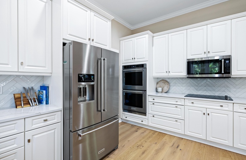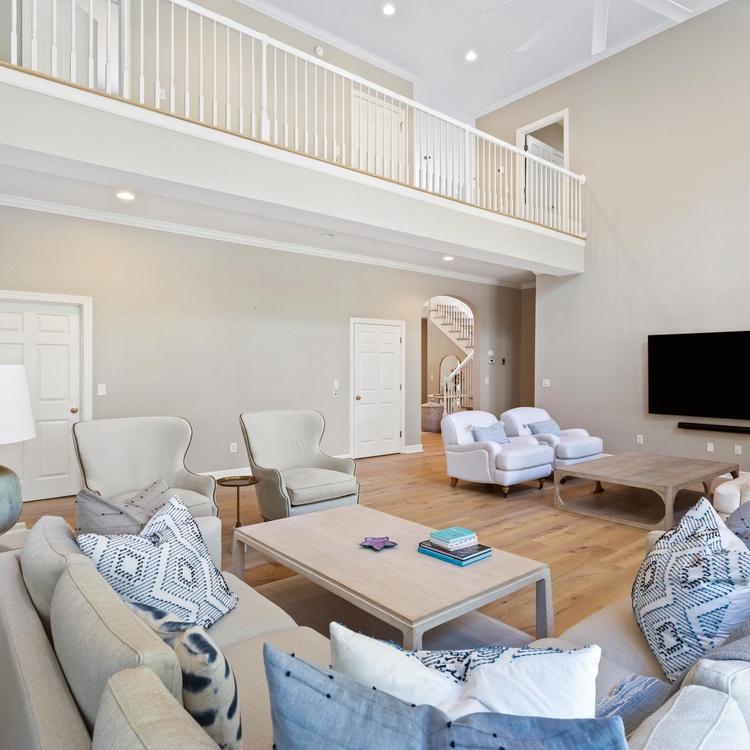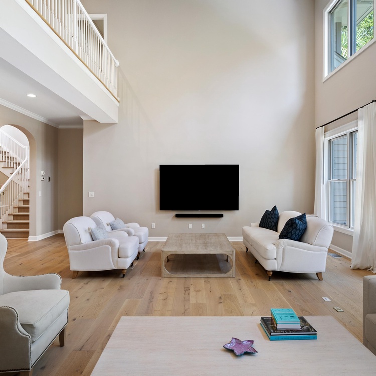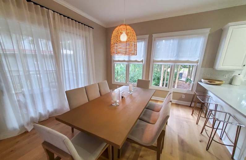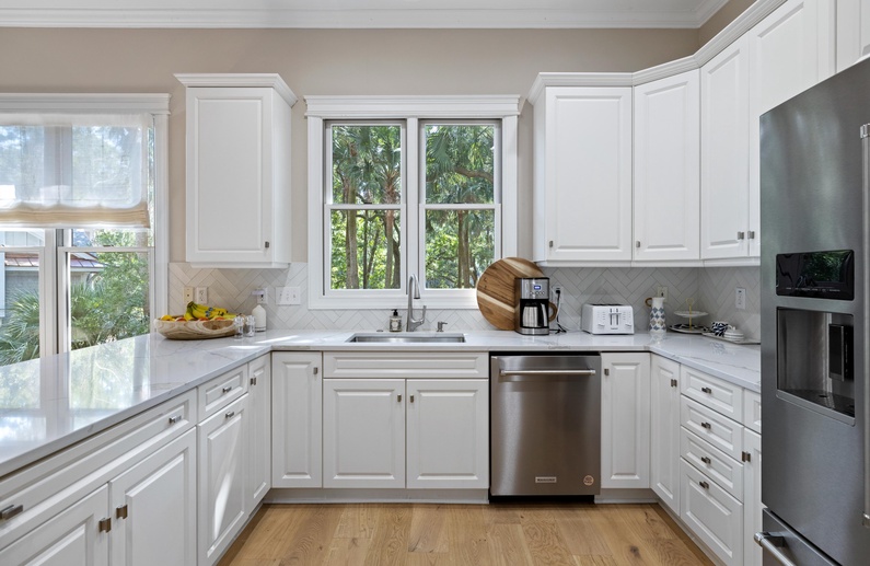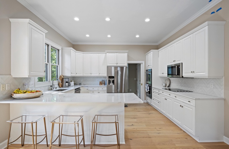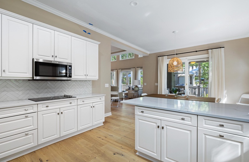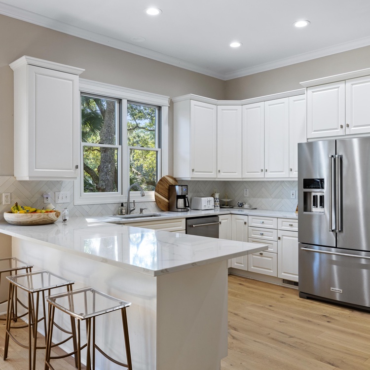 The home's open floor plan and high ceilings create a spacious and light-filled atmosphere, perfect for relaxing during your stay. Designed for seamless entertaining and gathering, the home's generous living space flows into the dining area and kitchen. The completely renovated kitchen features white custom cabinets, stainless steel appliances, and barstool seating.
