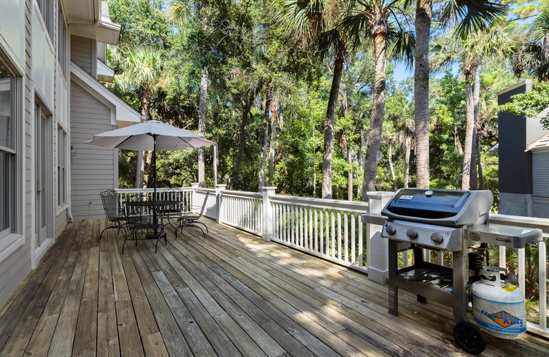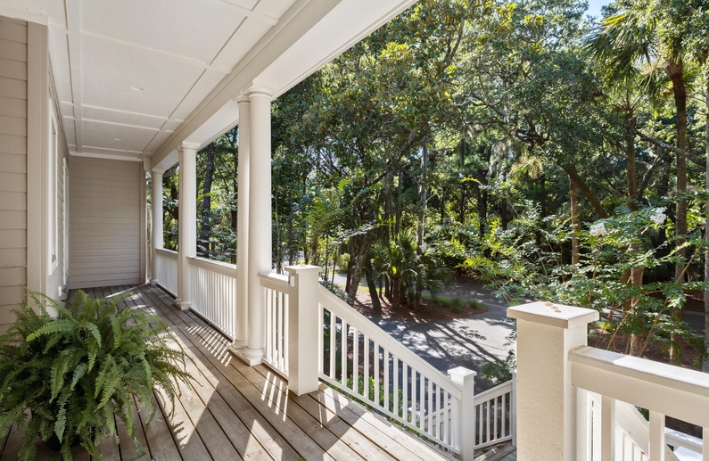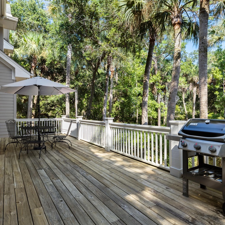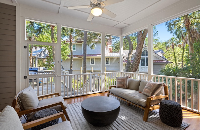 Enjoy Kiawah Island's natural environment from one of the home's many outdoor areas: a screened porch, back deck, and front porch await you. The screened porch has comfortable seating, a ceiling fan, and access to the open-air back deck. On the back deck, you will find a grill, a dining table and chairs, and views of Palmetto trees and lush vegetation.