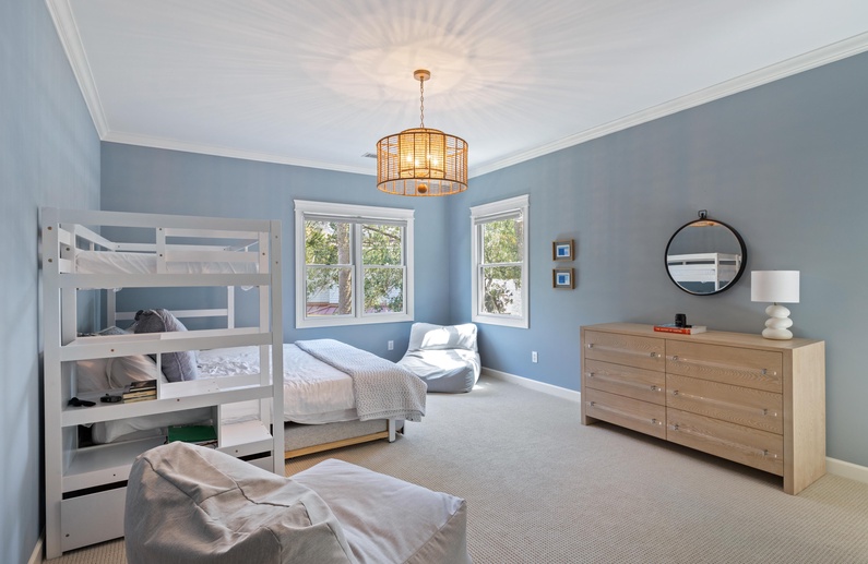 The primary suite is located on the main floor and offers a king-sized four-poster bed, scenic wooded views, and a private bathroom with dual-sink vanity, soaking tub, and walk-in shower. Off the main living area, you will find an additional room with a queen sleeper sofa. Upstairs, you will find three sizeable guest bedrooms with en suite bathrooms. The first upstairs bedroom is a tranquil retreat with a king-sized bed. The next bedroom has a full-sized bed with a twin trundle. A bedroom with a twin-over-king bunk bed completes the second floor.