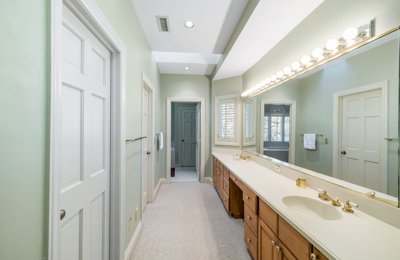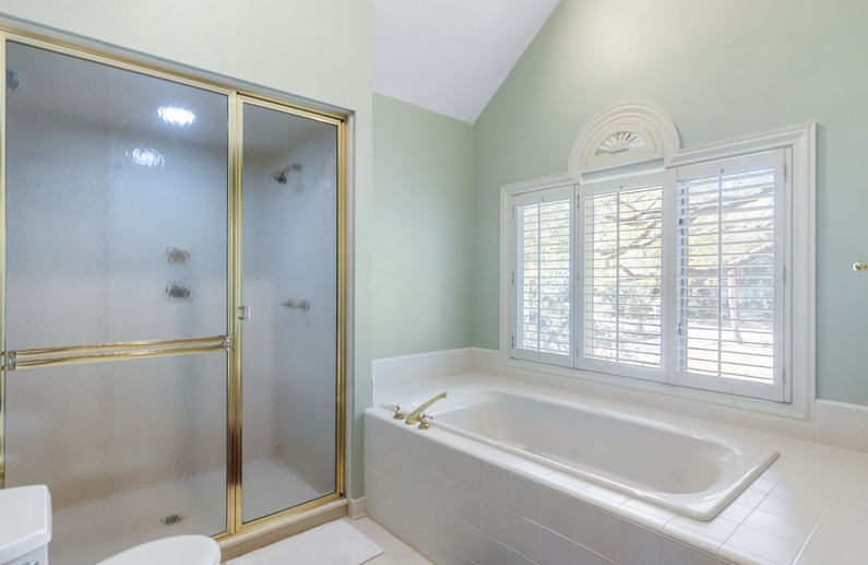 The spacious primary suite includes a king bed, TV, and an en suite bathroom with double sinks, a soaking tub, and a walk-in shower. Two additional king bedrooms each offer their own bathrooms, while the fourth bedroom features two queen beds and access to a full bath with a shower/tub combination, ideal for families or groups.
