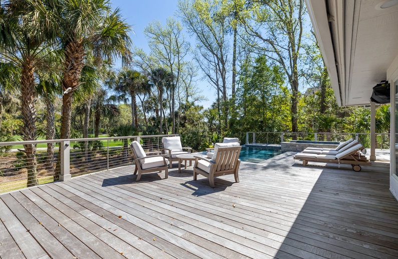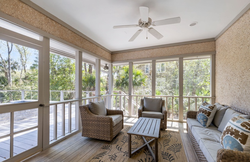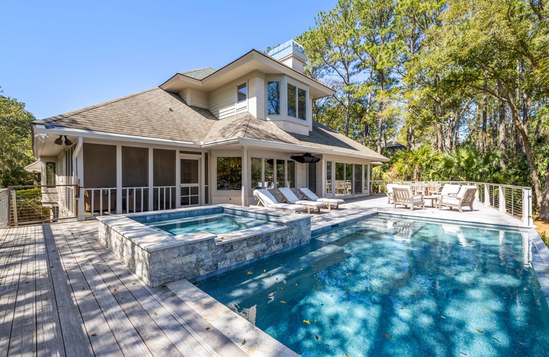 This inviting Kiawah Island vacation rental features 4 bedrooms and is an 8-minute bike ride to the beach. With scenic views of the Osprey Golf Course, comfortable screened in porch, plus a private pool and spa, 215 Yellowthroat Lane provides a relaxing setting to enjoy Kiawah’s natural beauty, inside and out.