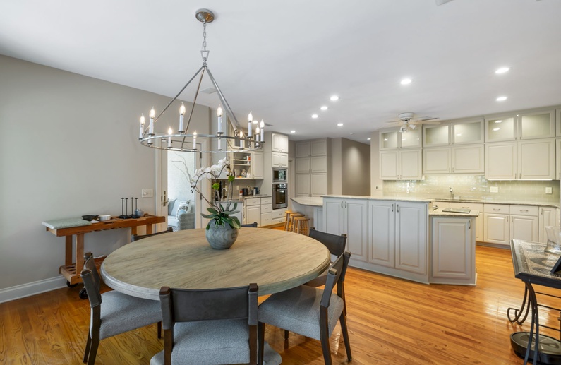 The fully equipped kitchen features clean white cabinetry, stainless steel appliances, and an AGA range cooker, along with bar seating for three. Just beside it, the dining area includes a round table with seating for six, creating a comfortable space for shared meals.