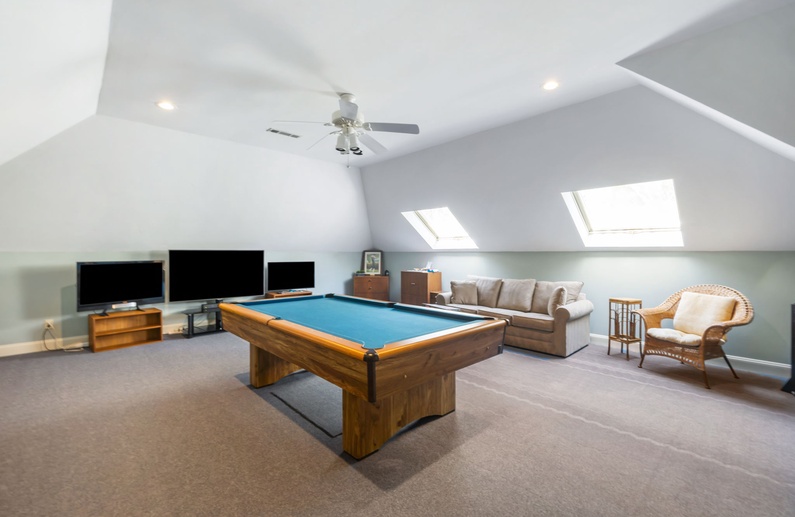 Above the garage, a separate game room adds extra space and is complete with a pool table, TV, and two pullout sofas.