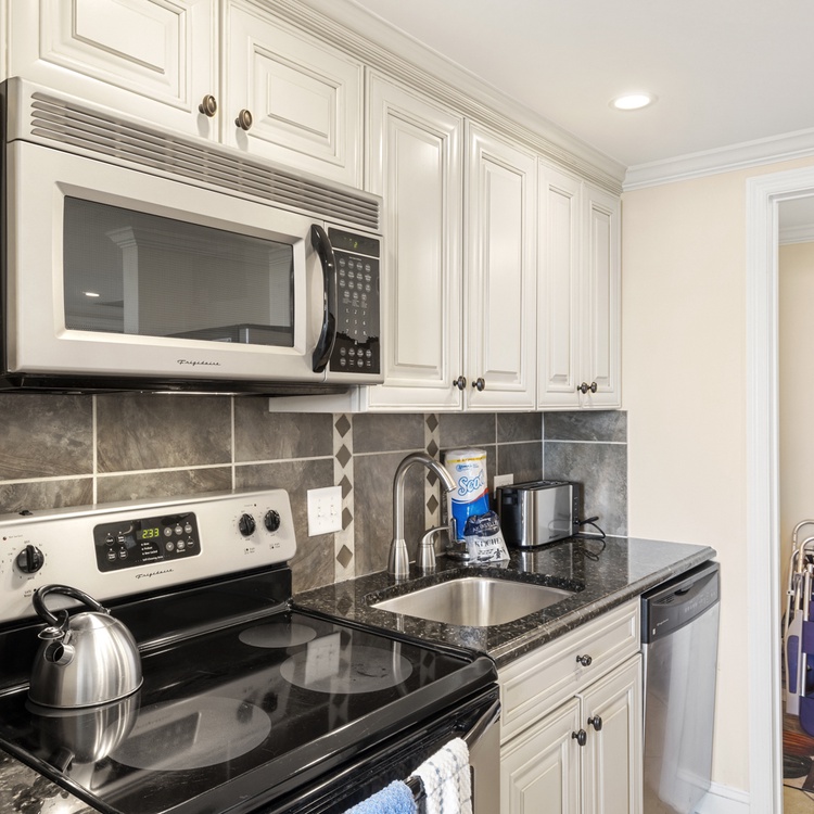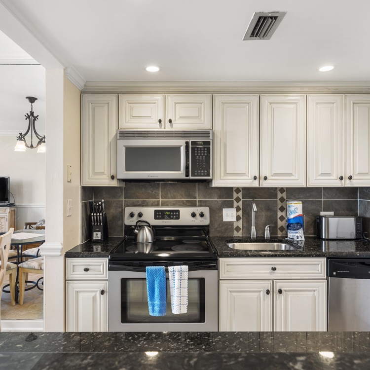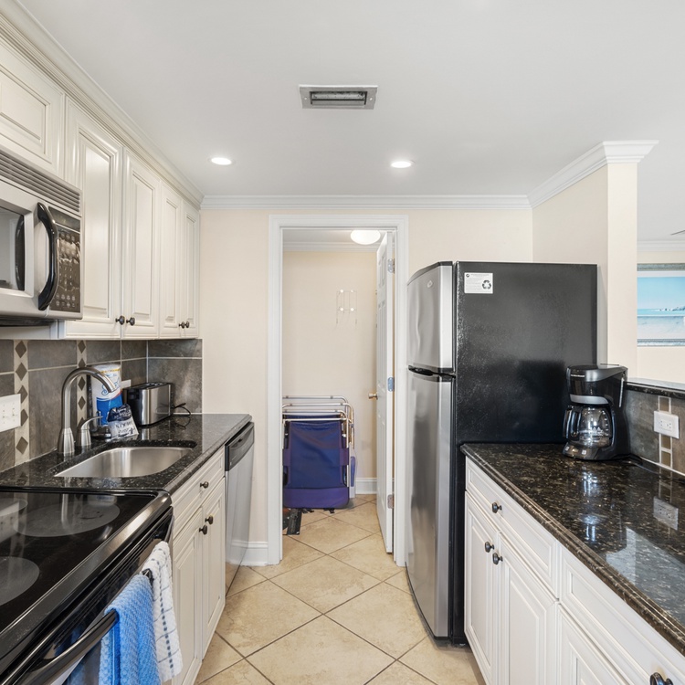 Every item you'll need to make a gourmet meal is available in the fully equipped kitchen with black and stainless steel appliances, granite countertops, and custom tile work. Enjoy the ocean views while preparing meals for family or friends. There is rich ceramic flooring in the kitchen for easy clean-up. Your meals can be enjoyed on the beachfront balcony or feasted at the dining table with seating for four.