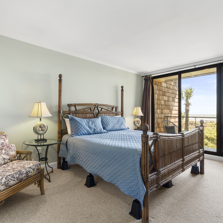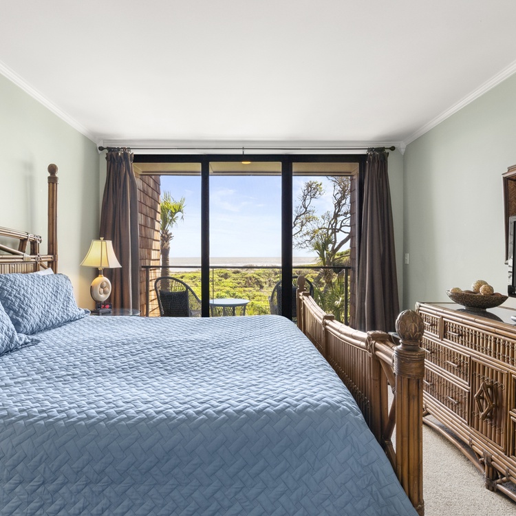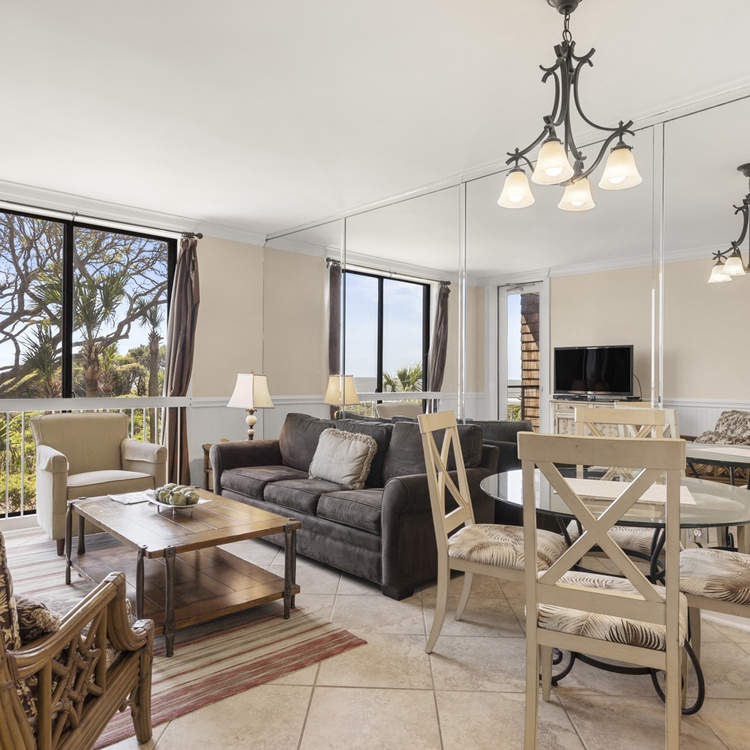 This second-floor Kiawah Island oceanfront vacation rental is a relaxing retreat. The main living area is a comfortable open space and offers cozy seating and a large window that lets in the views and ocean breezes. There is a sleeper sofa in the living room.